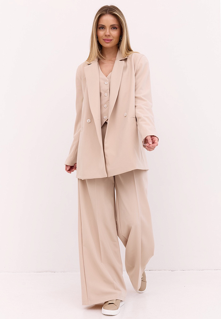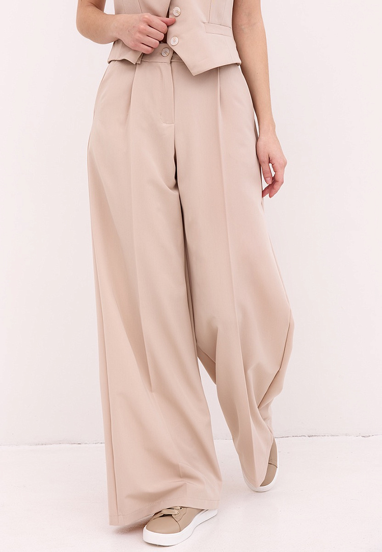 Детали: брюки свободного силуэта, расширенные к низу. Пояс со шлевками и резинкой по спинке. Гульфик на молнии, пояс застегивается на пуговицу. Карманы. Защипы по переду. Спереди и сзади заутюженные стрелки.