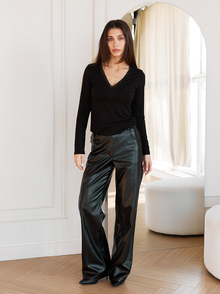 Брюки из черный экокожи? Вдохновившись эпатажными образами звезд Голливуда, предлагаем сделать ваш праздничный образ самым запоминающимся в компании! Экокожа хорошо тянется и сделает ваши движения комфортными, а высокая талия позволит носить брюки с топами.