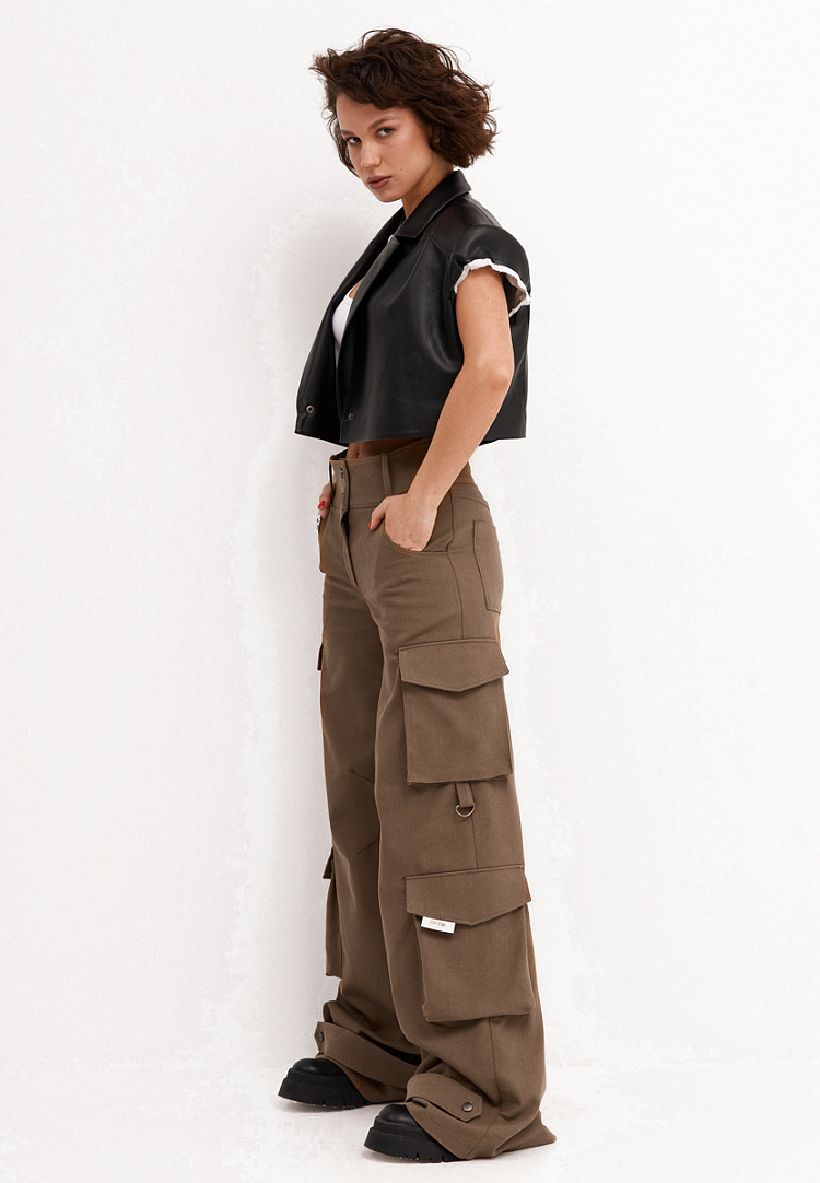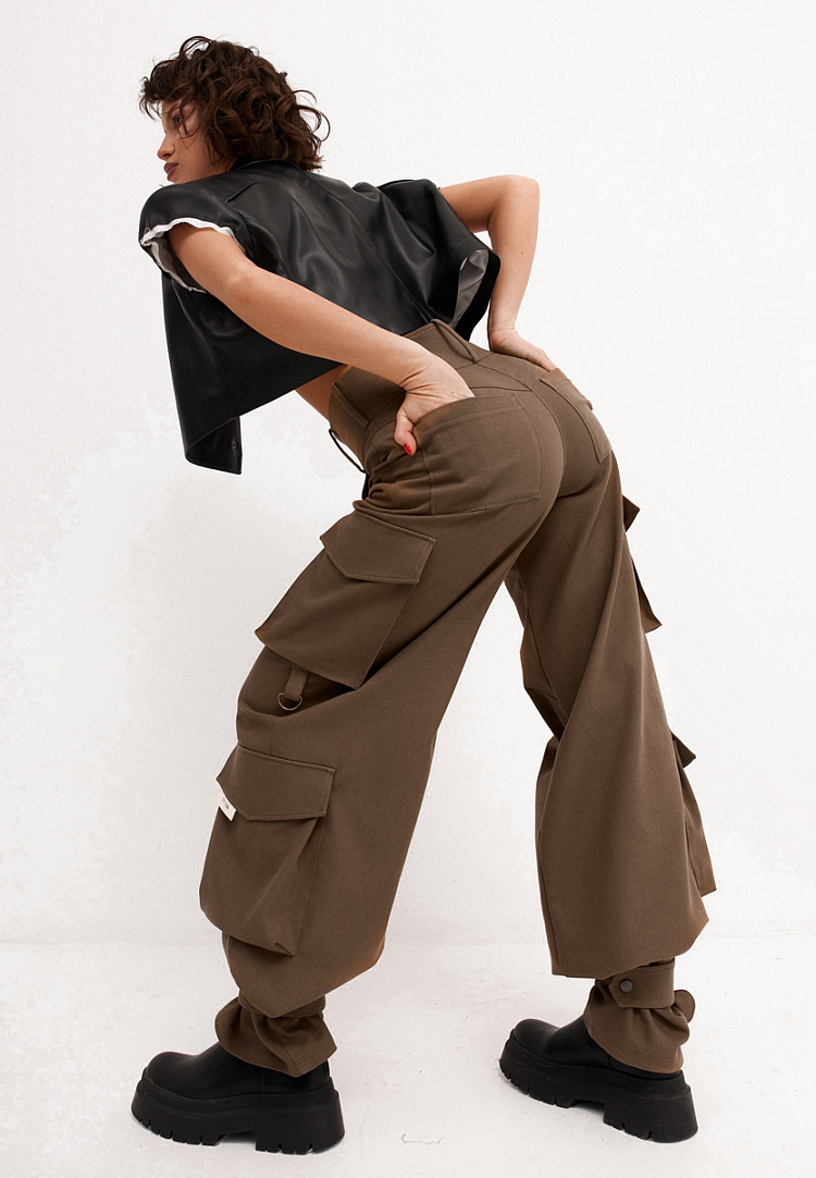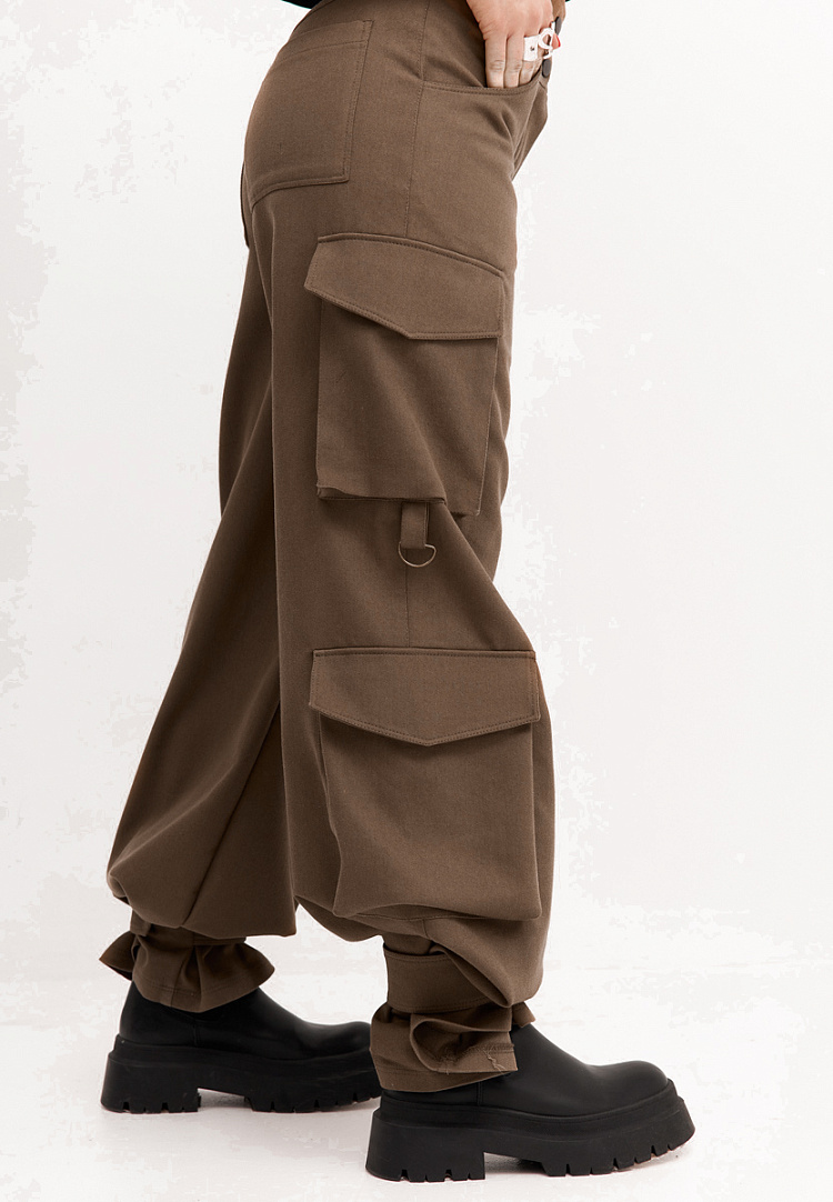 Детали: брюки карго на широком поясе с высокой посадкой. Пояс застёгивается на 2 кнопки. На задних половинках накладные карманы. В области колена на передних половинках расположены карманы. В области бокового шва на каждой брючине обработаны накладные карманы "портфель" с клапанами. К низу нижнего бокового накладного кармана пришита петля с полукольцом. В шаговый шов по низу изделия пришита пата.