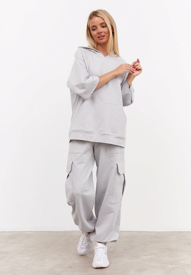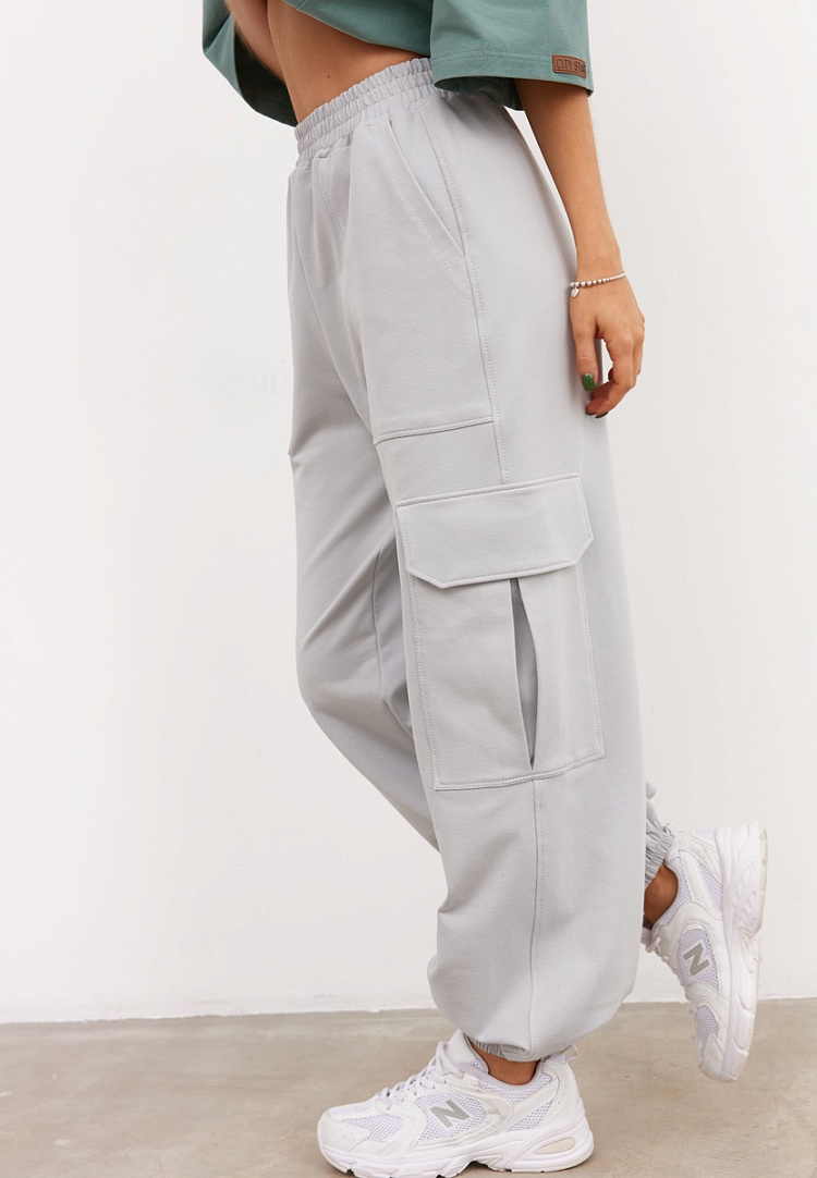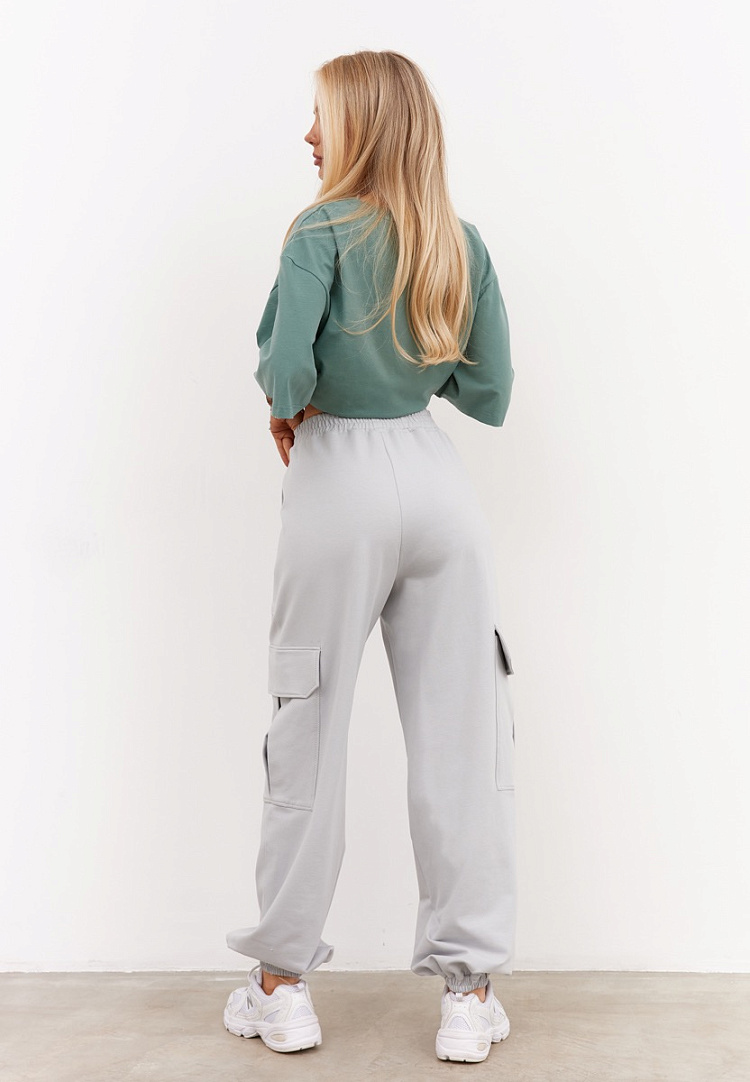 Детали: брюки карго из футера. По переду большие накладные карманы, по бокам накладные карманы со складкой по середине. По бокам также имеются клапаны, низ брюк манжет на резинке. Пояс брюк на резинке с равномерными отстрочками.