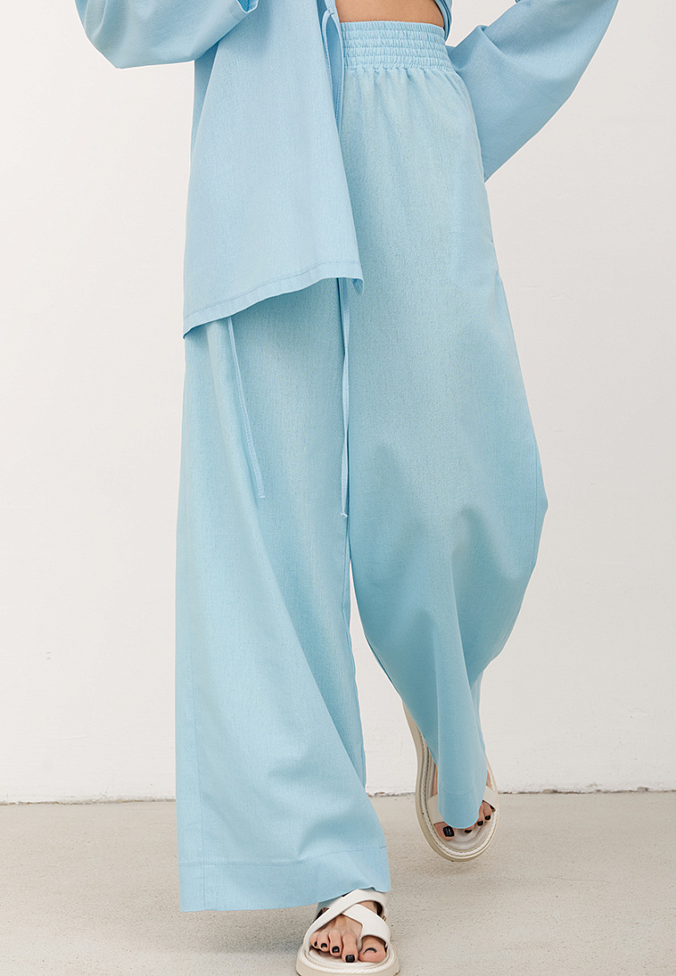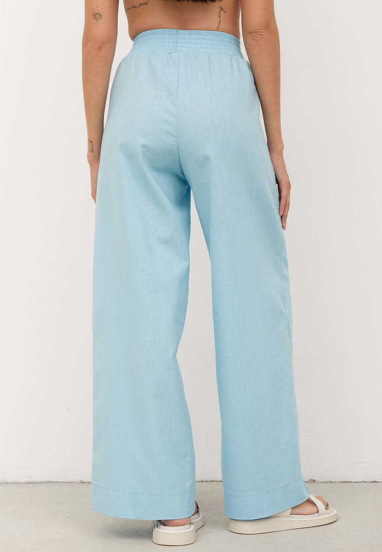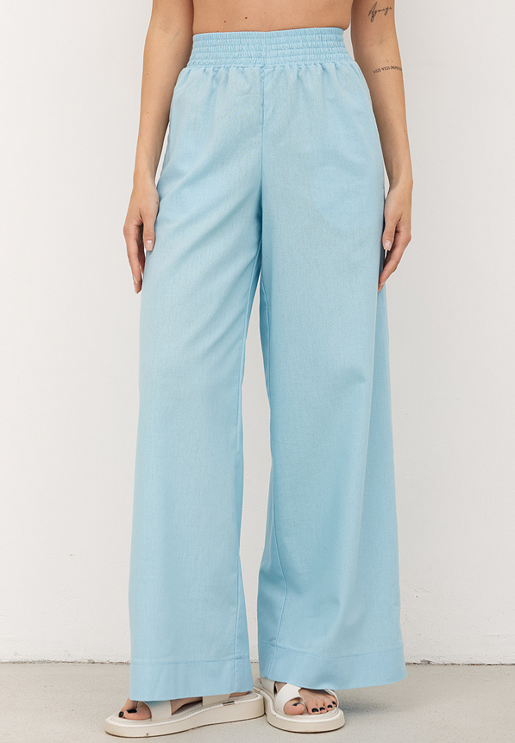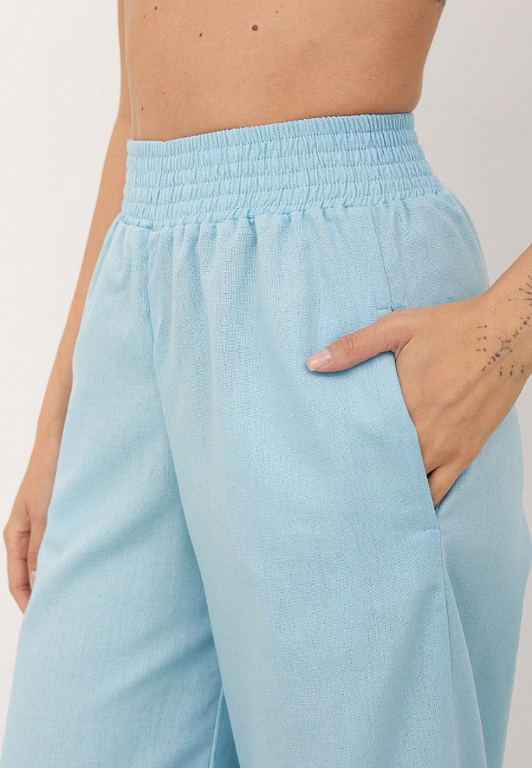 Детали: льняные брюки-трубы. Пояс на резинке с равномерными отстрочками. Карманы в боковом шве. По низу брюк широкая подгибка.