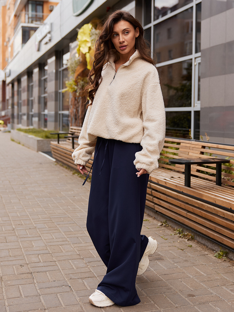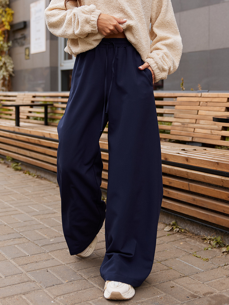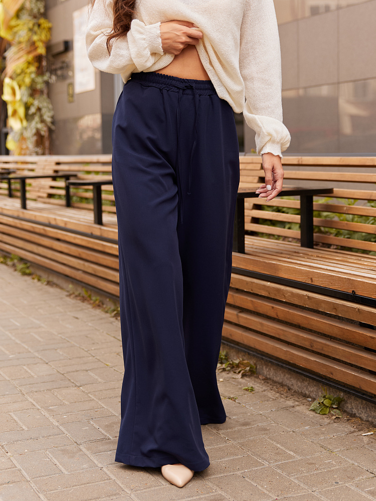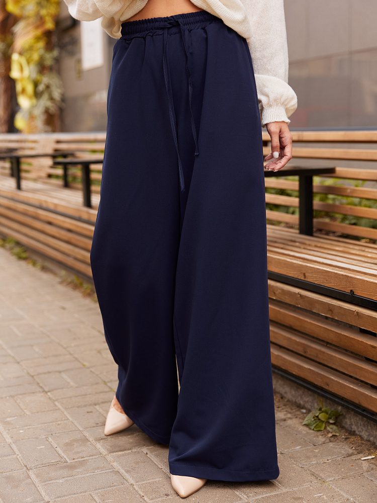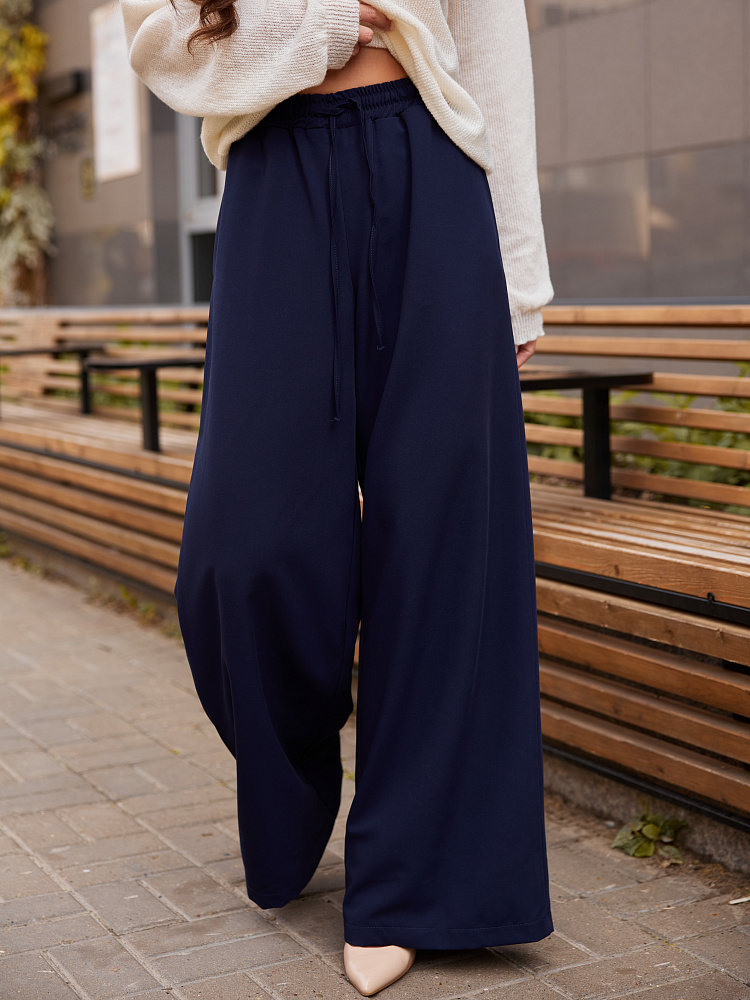 Детали: брюки свободного силуэта, расширенные к низу. Пояс на резинке. По переду пояса кулиска. Шнур из основной ткани.