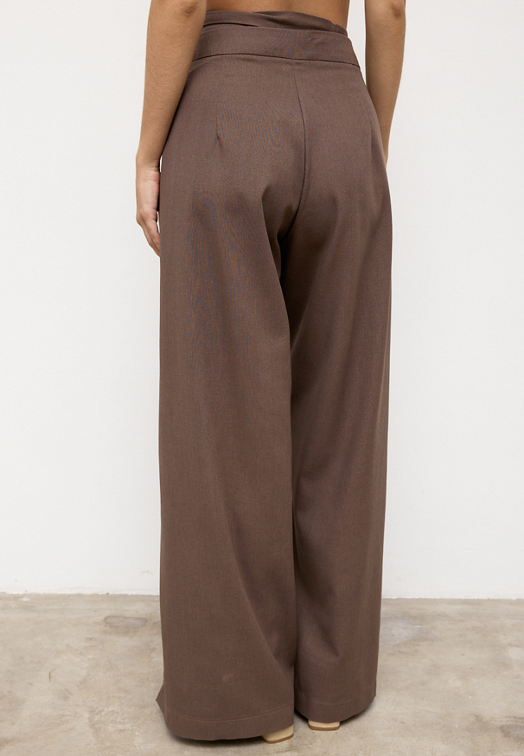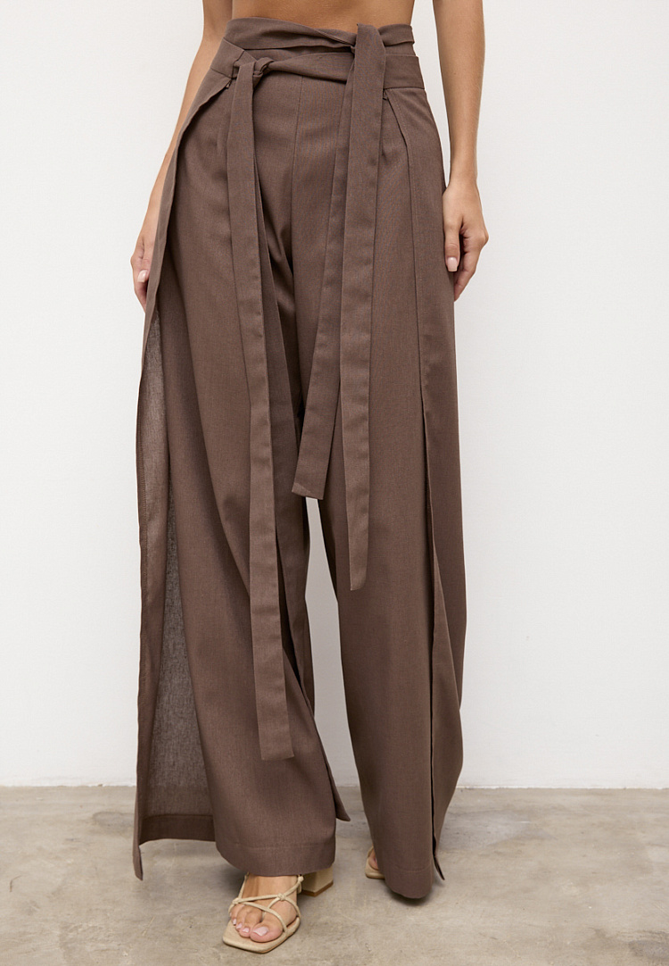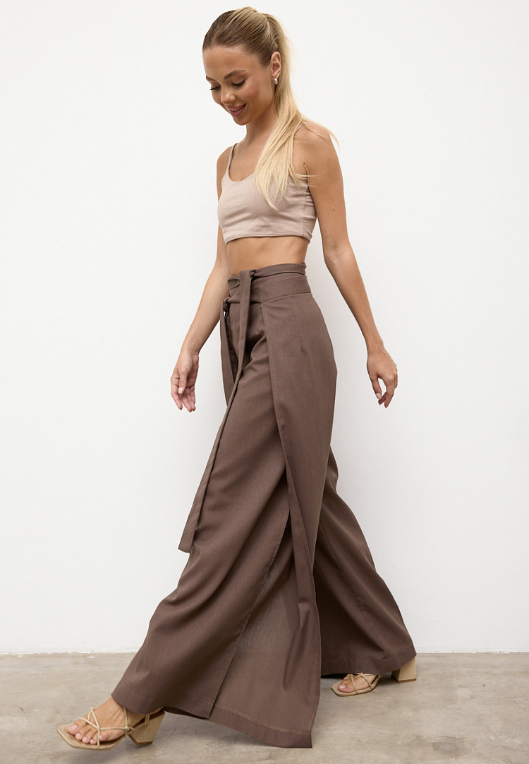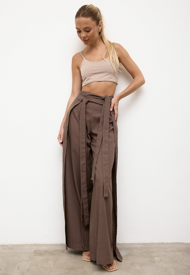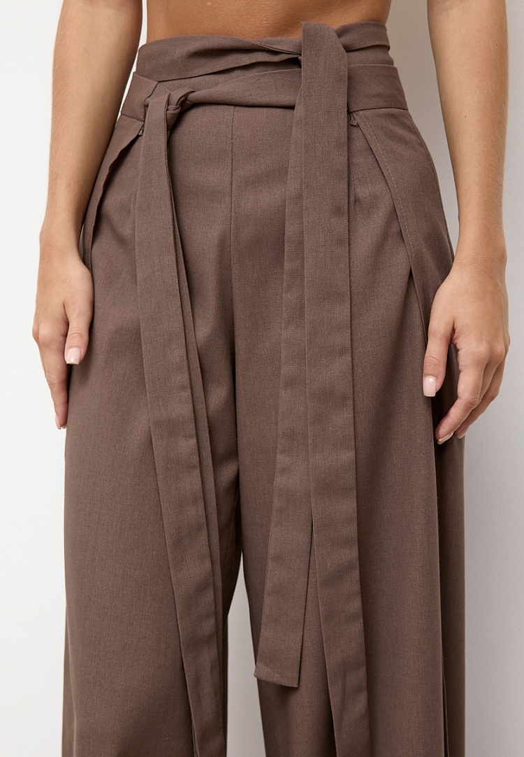 Детали: широкие брюки с отлетными боками на поясе. Сначала завязываем переднее полотнище брюк по спинке с переходом на перед, далее завязываем заднее полотнище также с переходом по спинке к переду. Боковые швы задних брюк закрывают передние.