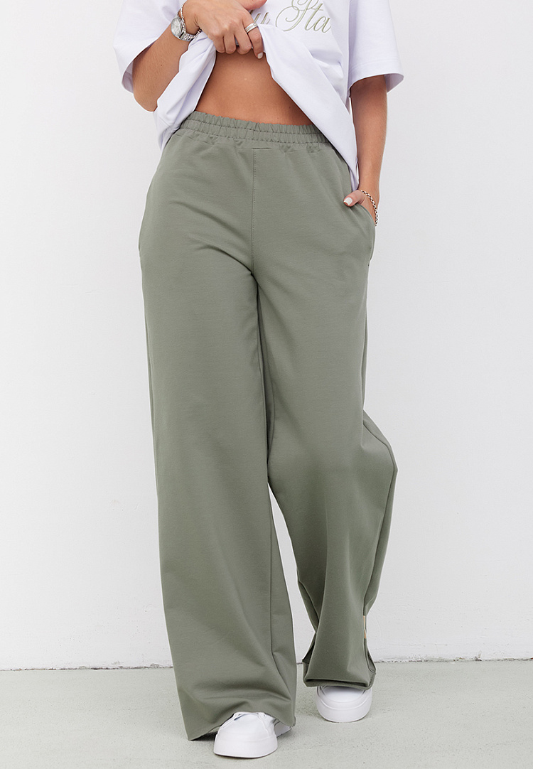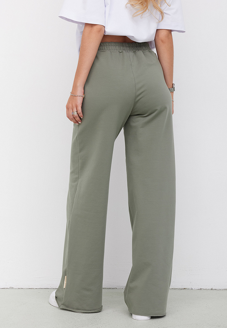 Детали: брюки свободного силуэта, расширенные к низу. Пояс притачной, карманы в боковых швах, низ с необработанным краем..