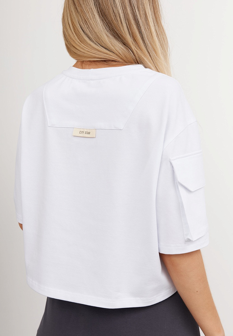 Детали: укороченная футболка из кулирки. Линия плеча спущенная, по горловине обтачка. По правому рукаву накладной карман с клапоном. По спинке декоративная кокетка с лейблом.