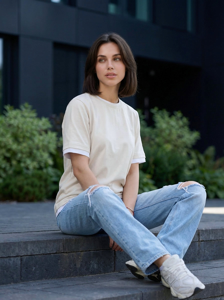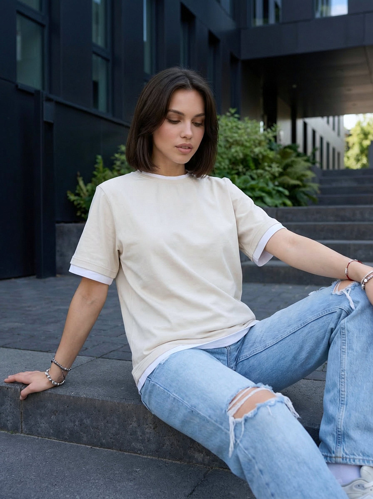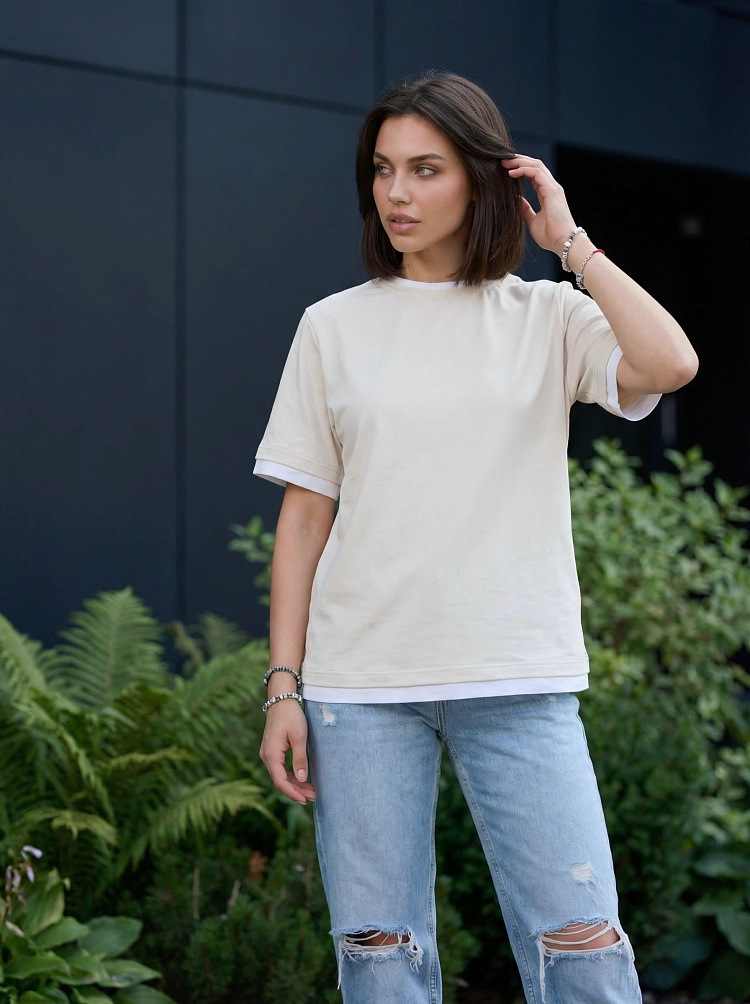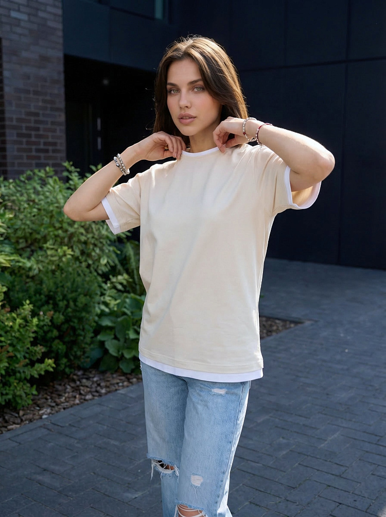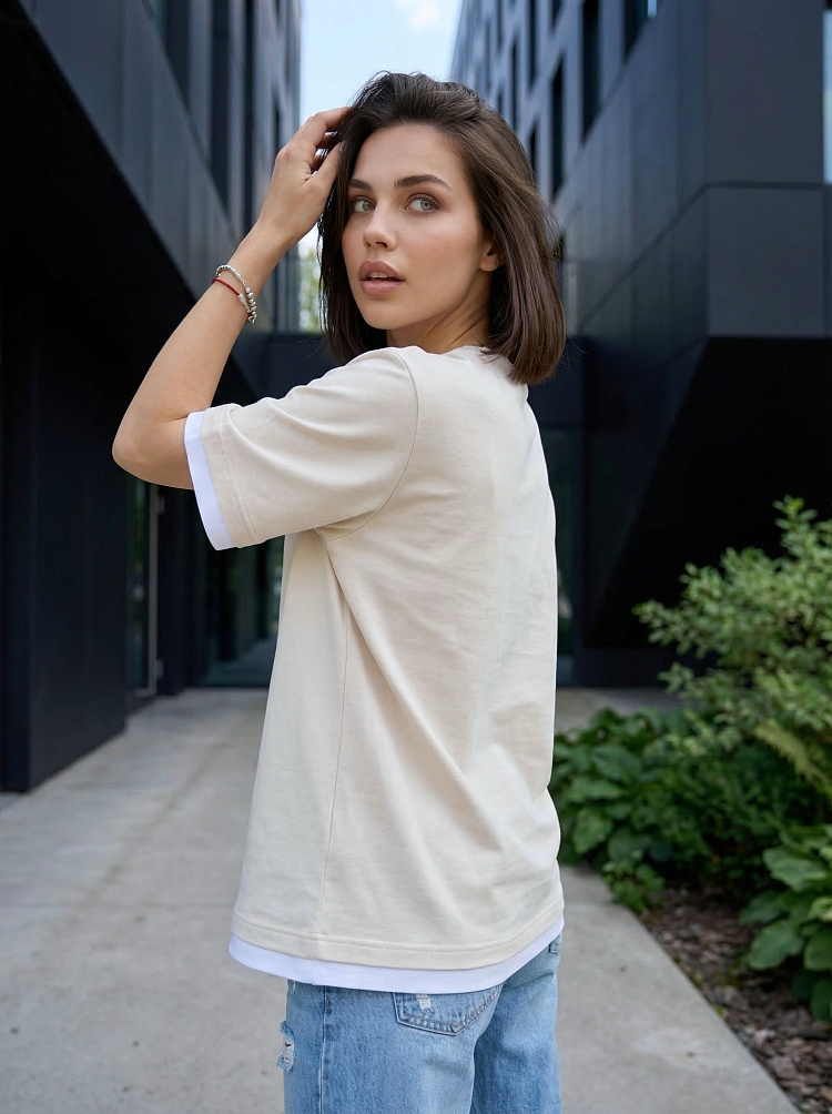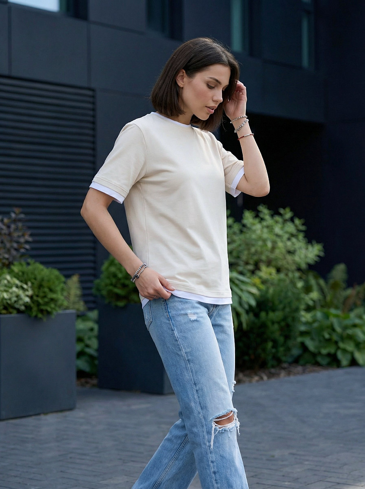 Декоративные вставки добавляют модели современный акцент и делают её более выразительной, сохраняя при этом лаконичный и универсальный стиль. Футболка легко сочетается с джинсами, брюками, шортами или юбками, позволяя создавать как расслабленные повседневные, так и более стильные городские образы.