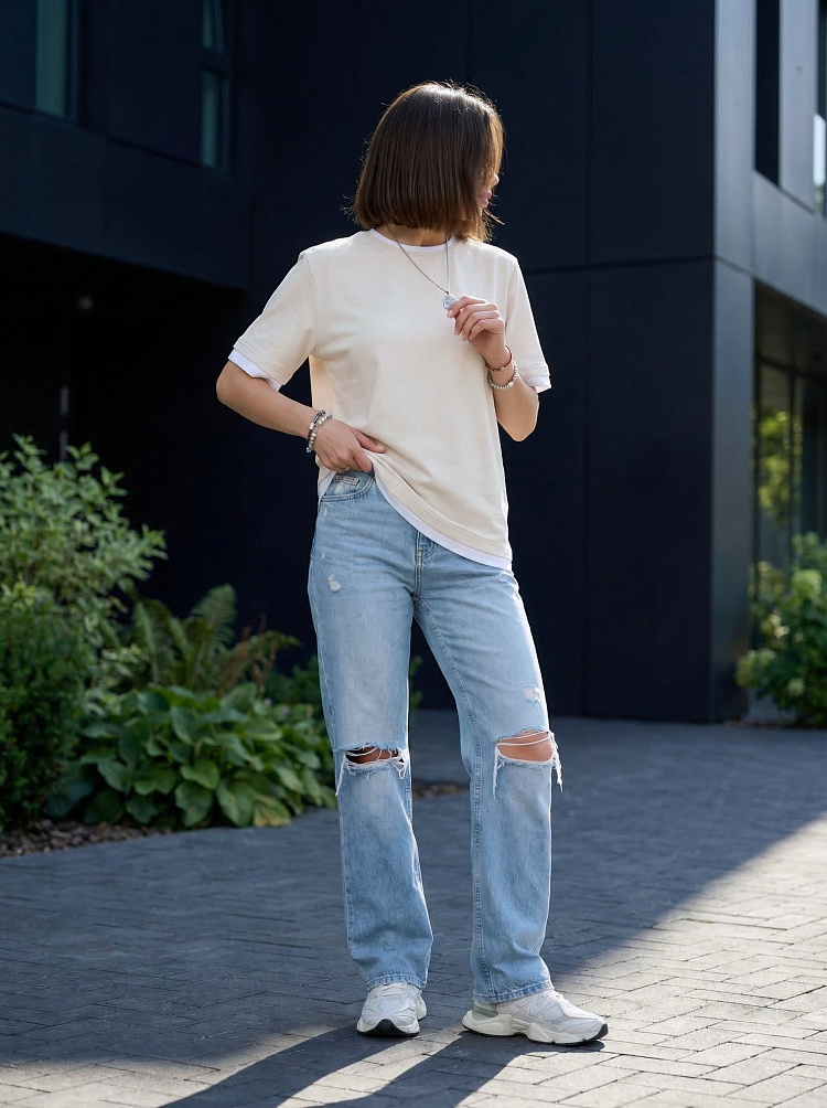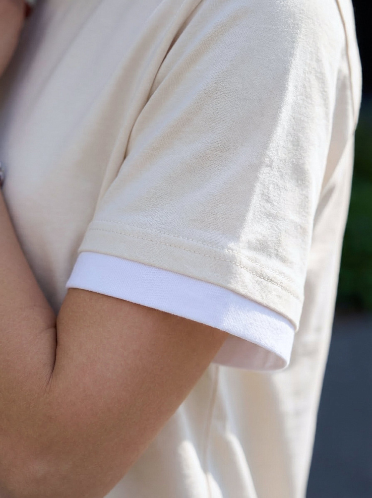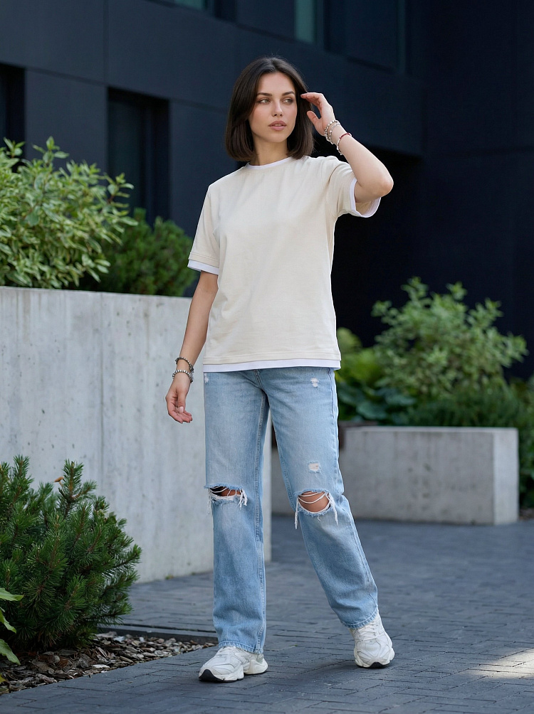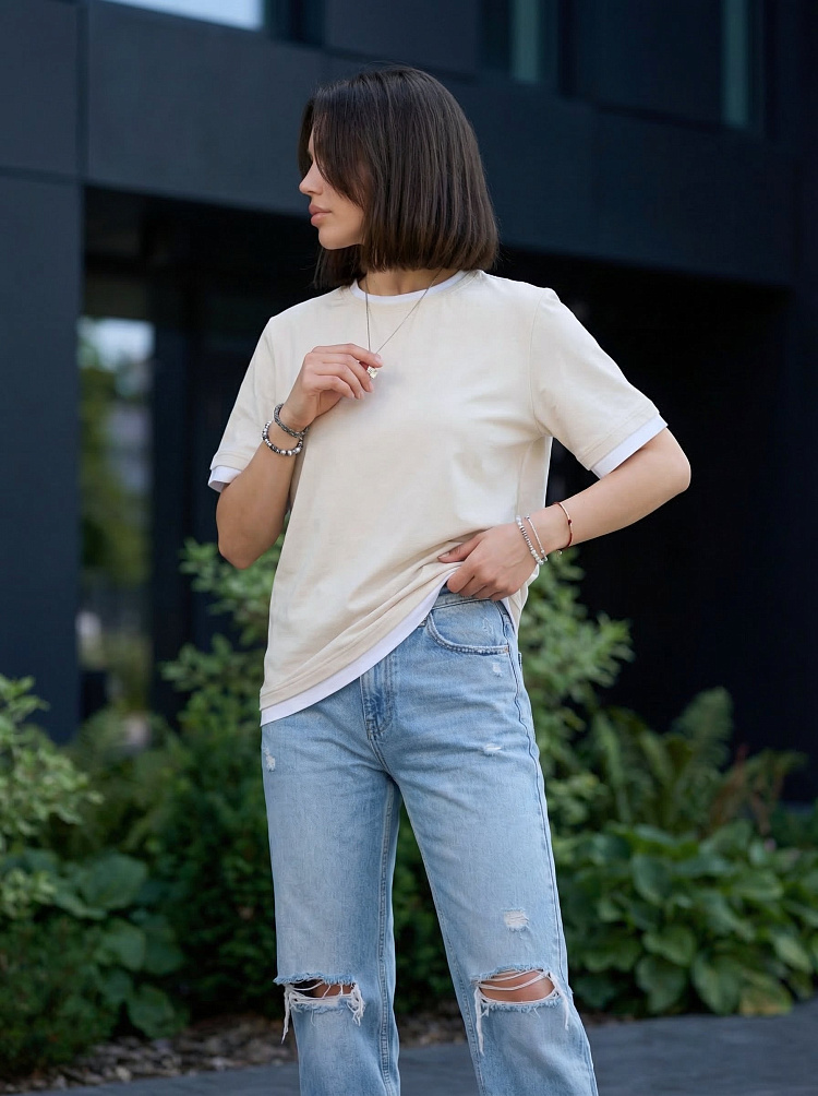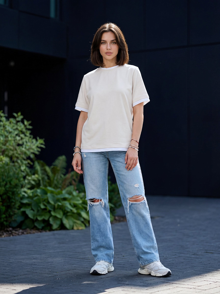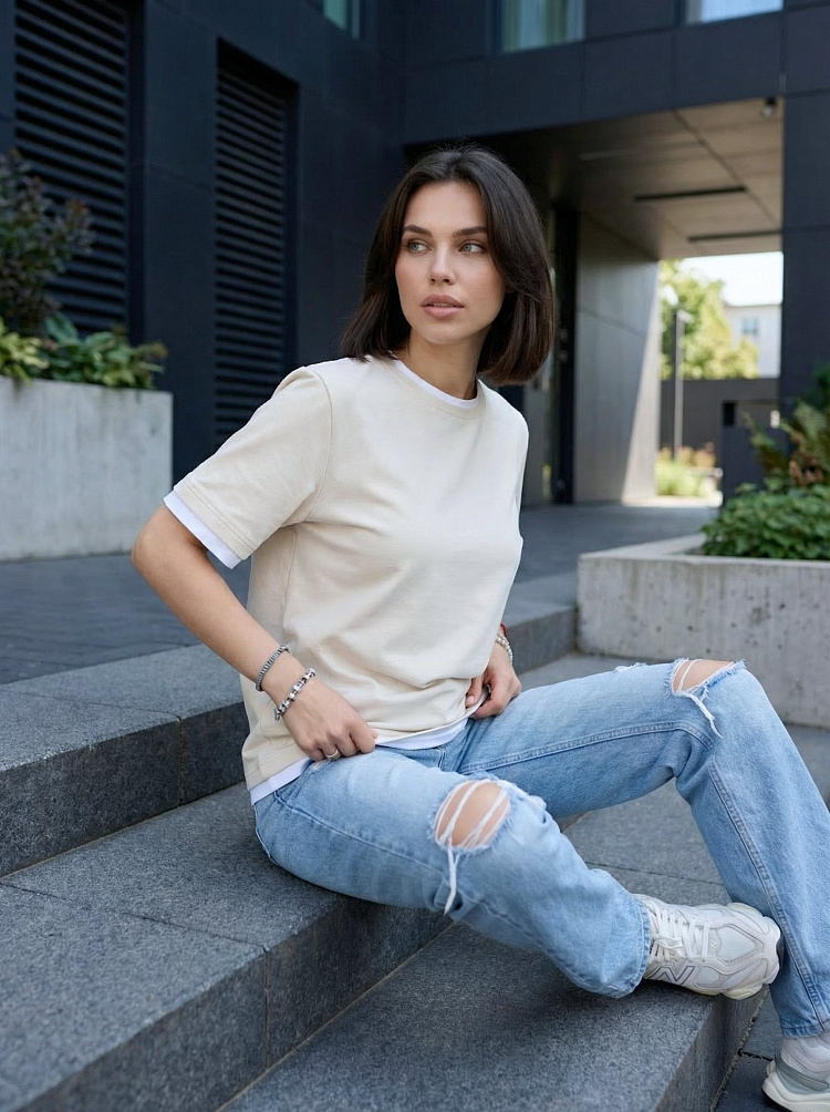 Декоративные вставки добавляют модели современный акцент и делают её более выразительной, сохраняя при этом лаконичный и универсальный стиль. Футболка легко сочетается с джинсами, брюками, шортами или юбками, позволяя создавать как расслабленные повседневные, так и более стильные городские образы.