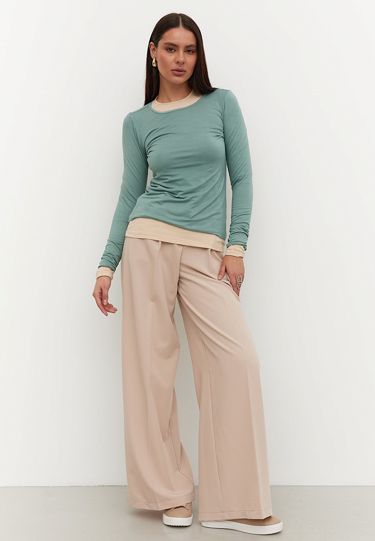 Детали: базовый двойной лонгслив из трикотажного полотна. В лонгсливе используется два цвета и игра длины, что придает эффект многослойности. Рукав втачной, силуэт приталенный. Горловины лонгсливов обработаны тонкой окантовкой. Лонгсливы можно носить по отдельности.