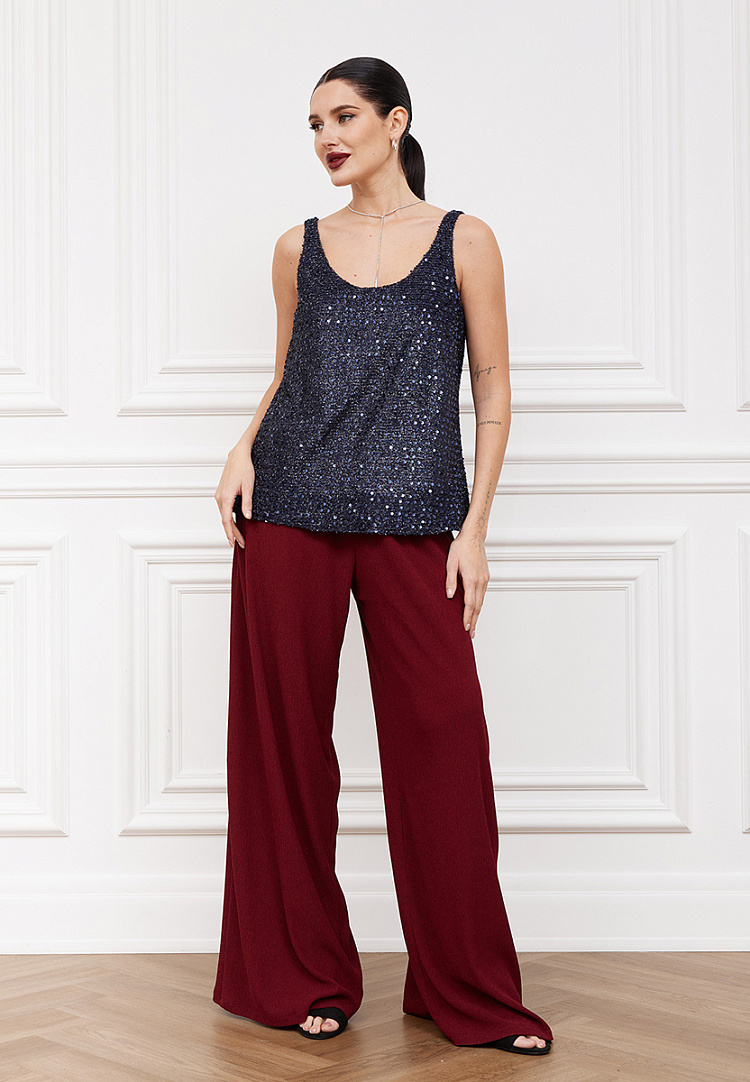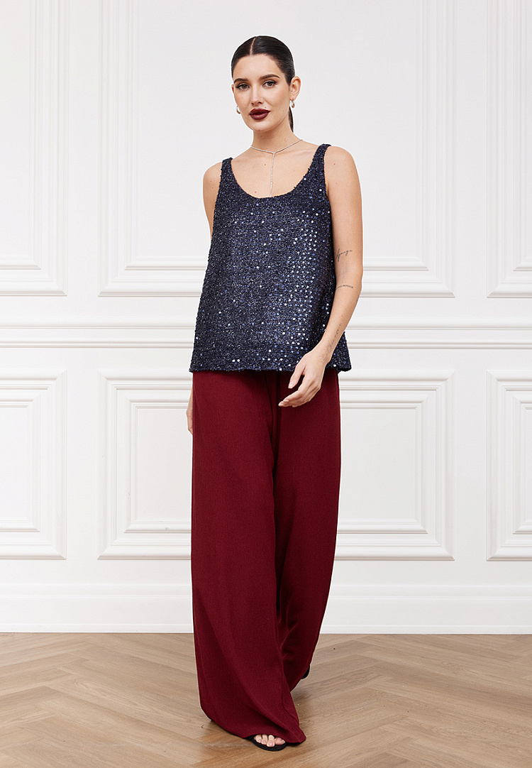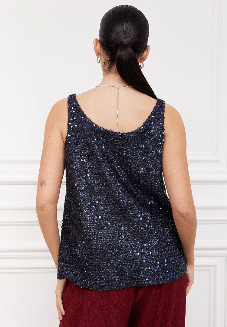 Детали: Топ из ткани в пайетку. Углубленная горловина по переду и спинке. Подклад топа из трикотажной ткани.