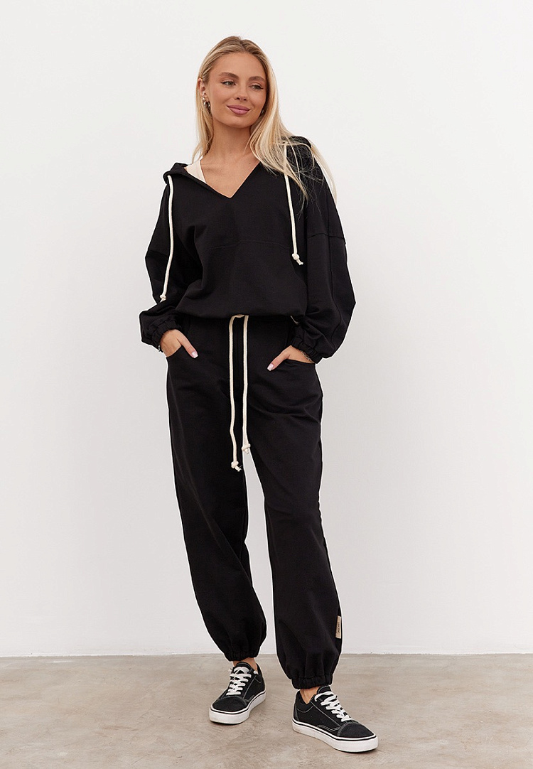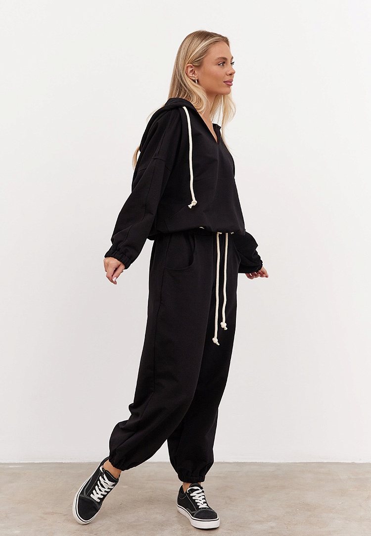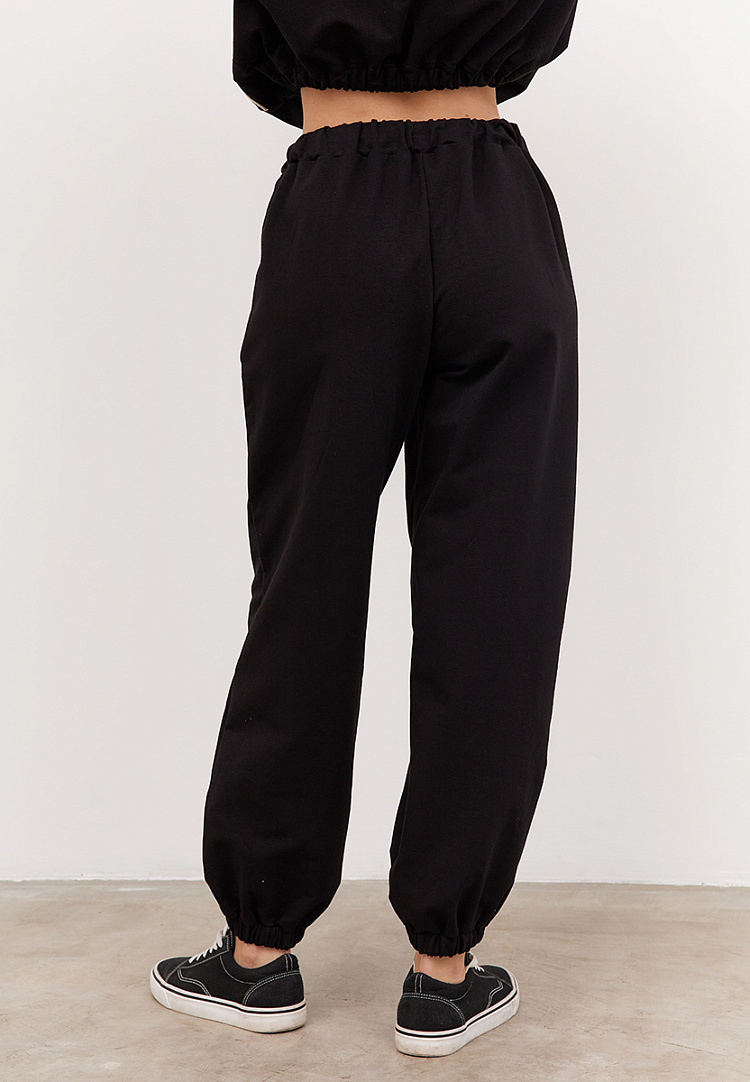 Детали: джоггеры объемного силуэта. Пояс на резинке с декоративной шнуровкой. Карманы полукруглой формы. По низу брюк резинка.