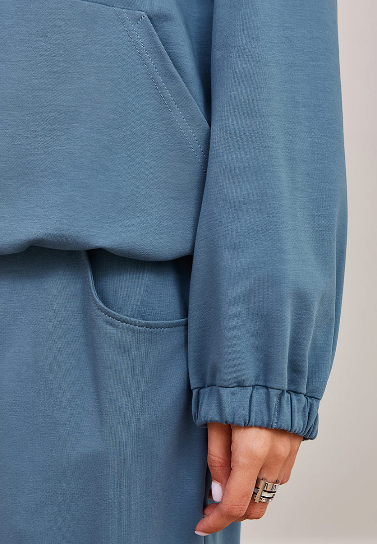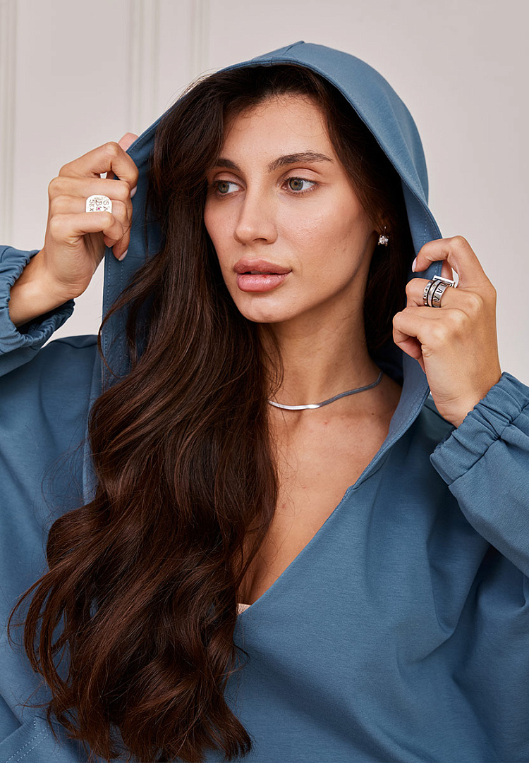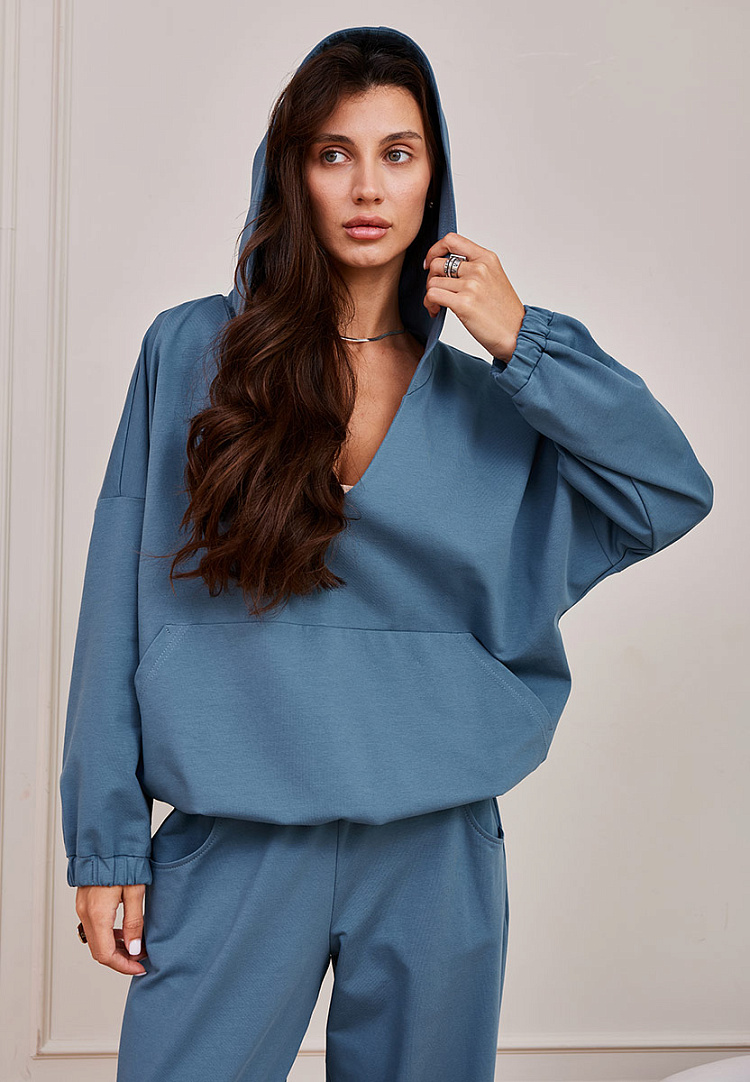 Детали: худи объемного силуэта. По переду глубокий вырез. Карман-кенгуру, линия плеча спущенная. По низу рукавов резинка.