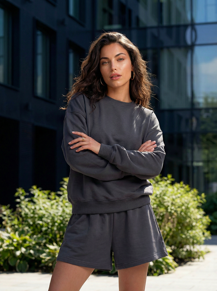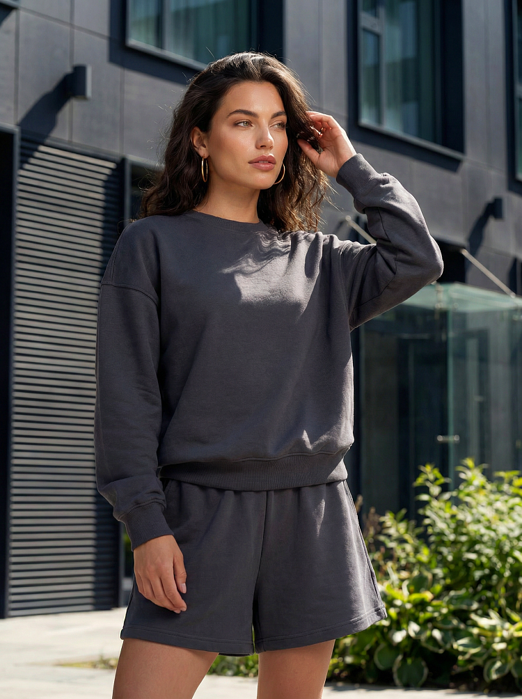 Легкий и стильный женский костюм в цвете графит — идеальный вариант для прогулок, отдыха и комфортных городских образов. Комплект состоит из свободного свитшота с длинным рукавом и удобных шорт на мягкой резинке. Расслабленный силуэт не сковывает движения и делает образ современным и аккуратным.
