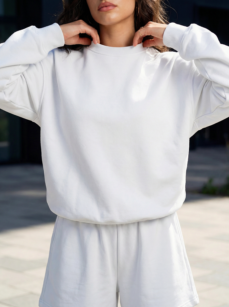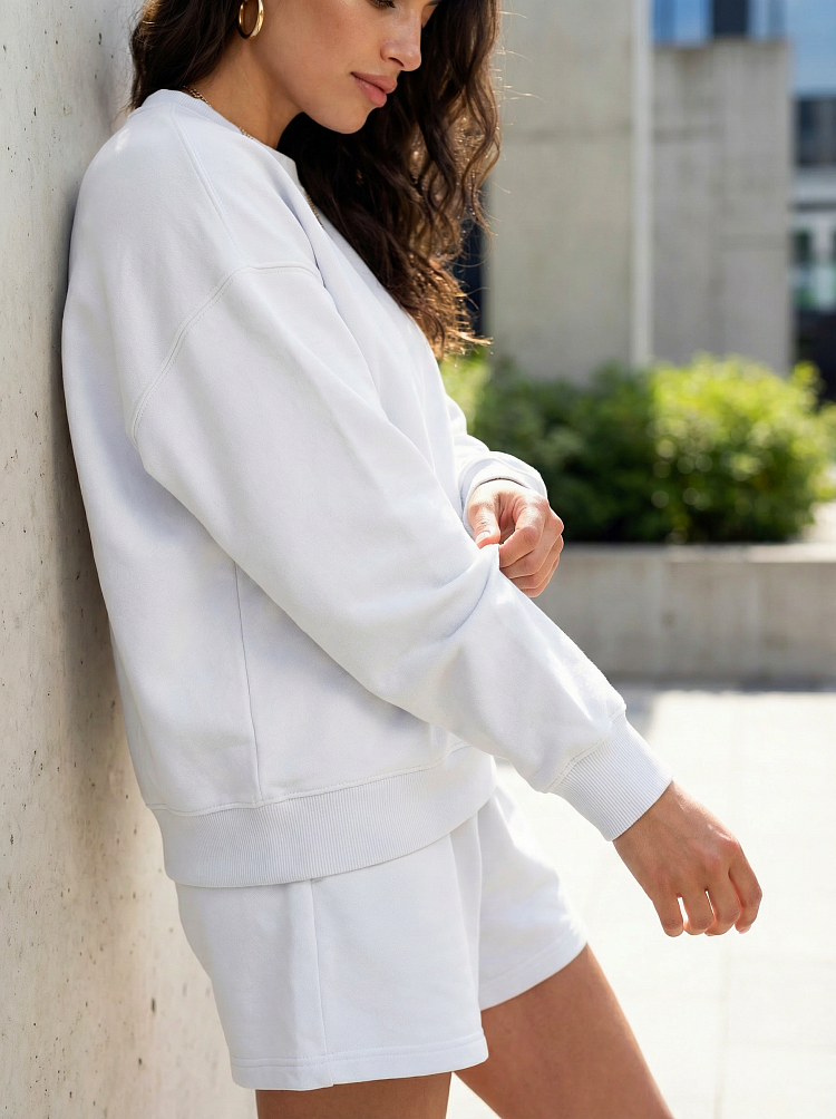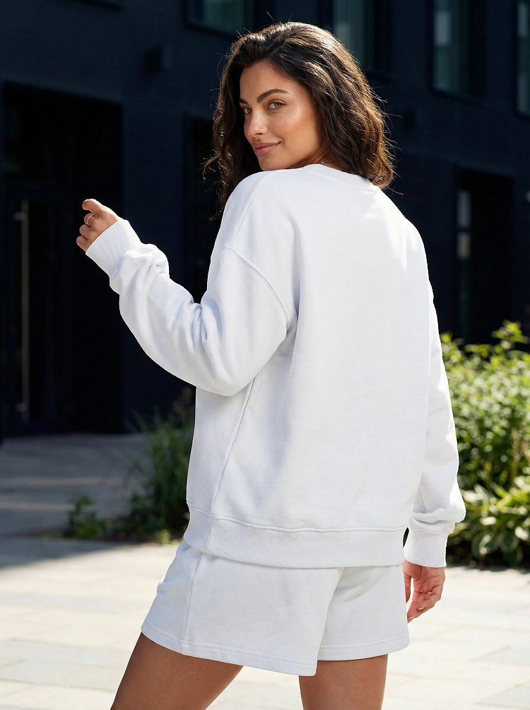Легкий и стильный женский костюм в белом цвете — идеальный вариант для прогулок, отдыха и комфортных городских образов. Комплект состоит из свободного свитшота с длинным рукавом и удобных шорт на мягкой резинке. Расслабленный силуэт не сковывает движения и делает образ современным и аккуратным. Костюм легко сочетается с кедами, кроссовками и базовыми аксессуарами. Подойдет для повседневной носки, поездок и уютных выходных. Преимущества: — актуальный свободный крой — удобные шорты на резинке — стильный комплект на каждый день — легко комбинируется с другой базовой одеждой.