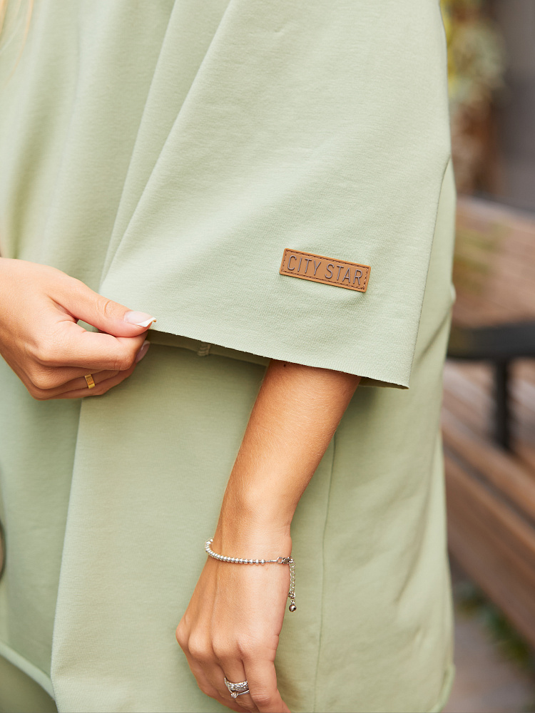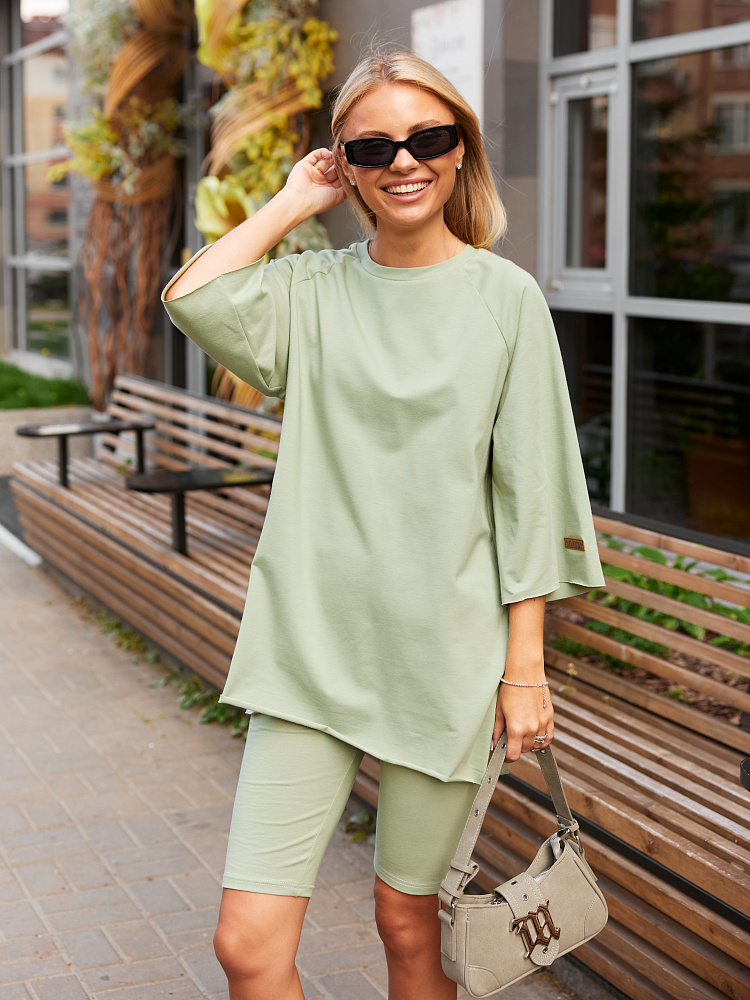 Детали: объемная футболка, рукав-реглан, необработанные края по низу футболки и рукавов. Велосипедки прилегающего силуэта, завышенная посадка.