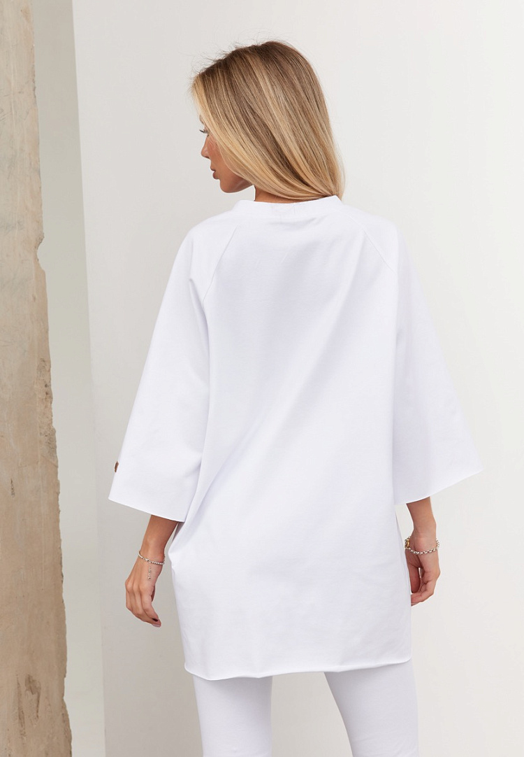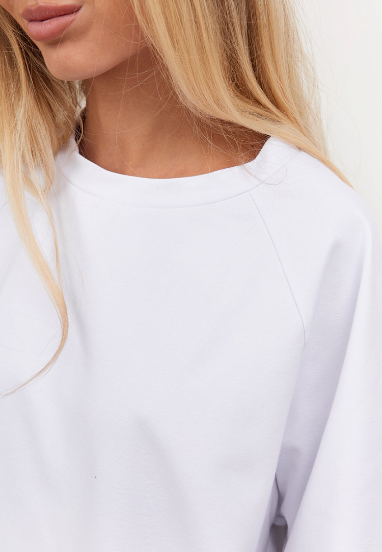 Детали: объемная футболка, рукав-реглан, необработанные края по низу футболки и рукавов. Велосипедки прилегающего силуэта, завышенная посадка.