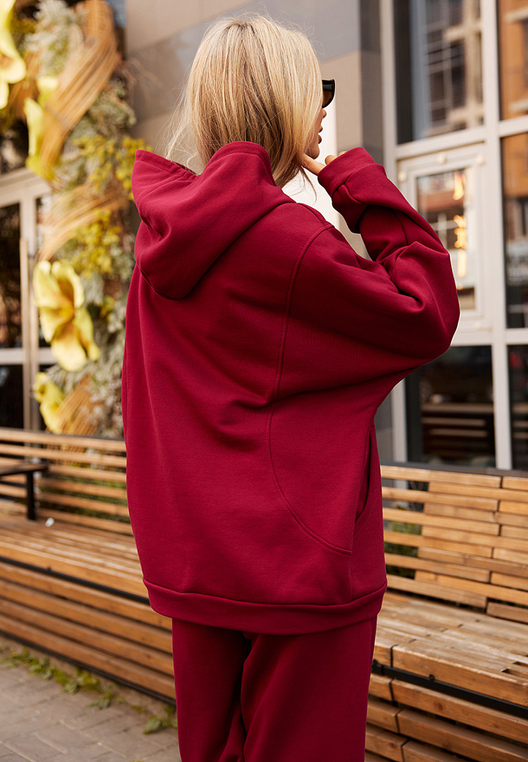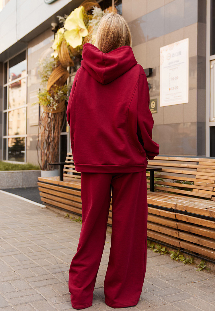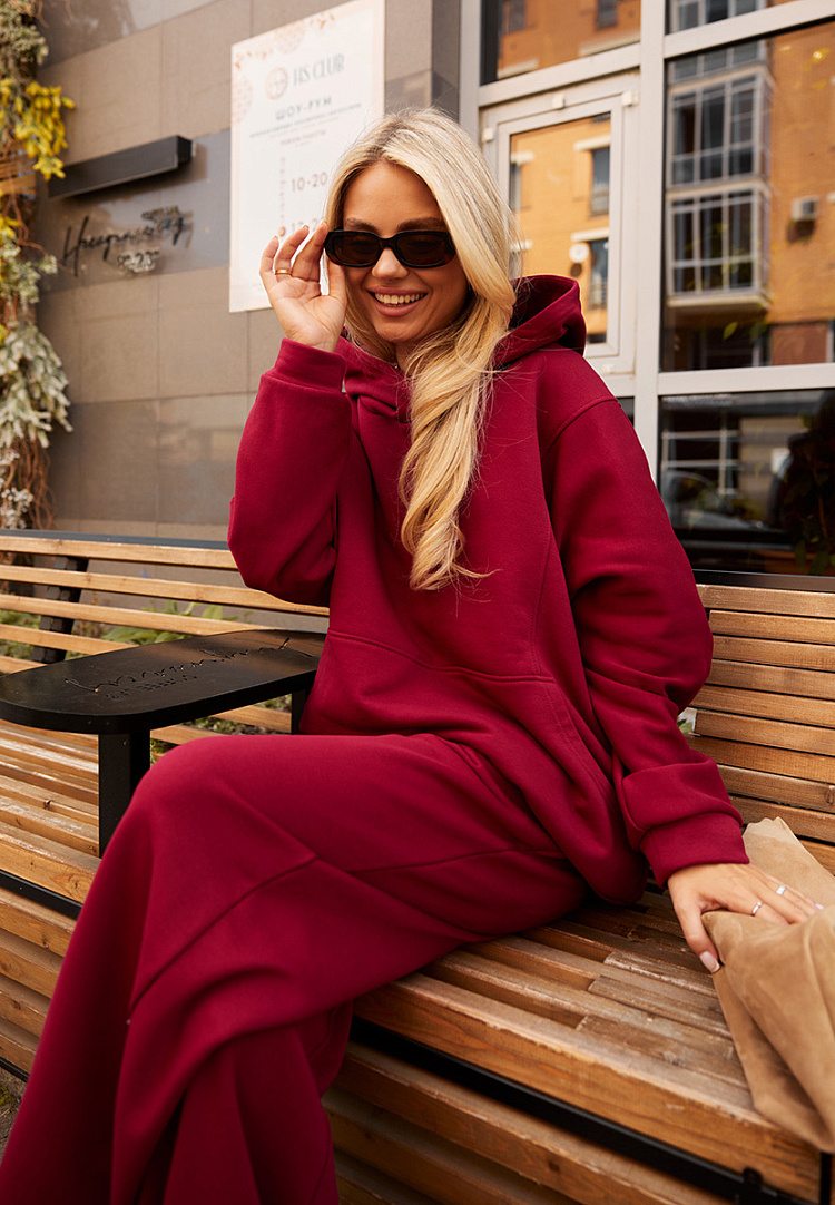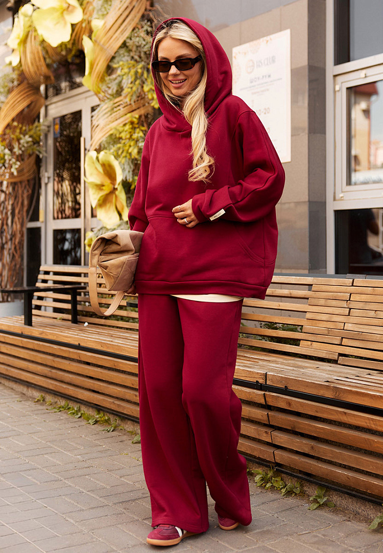 Костюм женский оверсайз без начеса двойка от бренда CITY STAR станет идеальным решением для любой девушки! Однотонный оверсайз костюм с худи и штанами отлично подходит как тренировочная одежда, и даже для повседневных выходов. Спортивный костюм бордовый женский без начеса имеет свободный крой и прекрасно сидит на всех типах фигур. Отсутствие начеса делает его приятным в тёплую погоду, а трикотажный материал обеспечивает воздухопроницаемость надежен в уходе не теряет форму. Подойдет как для прогулок по городу, так и для тренировок в зале, занятий фитнесом, спортом и бегом. Трикотажный костюм женский станет отличным выбором для и обеспечит комфорт для беременных женщин, благодаря удачному крою и свободному фасону, подойдет полным.