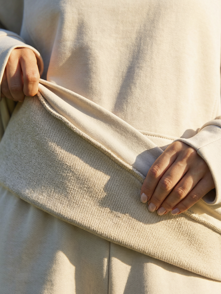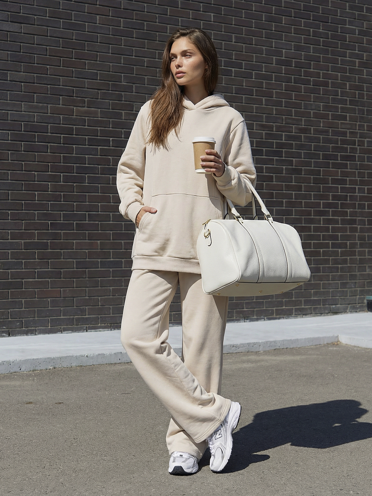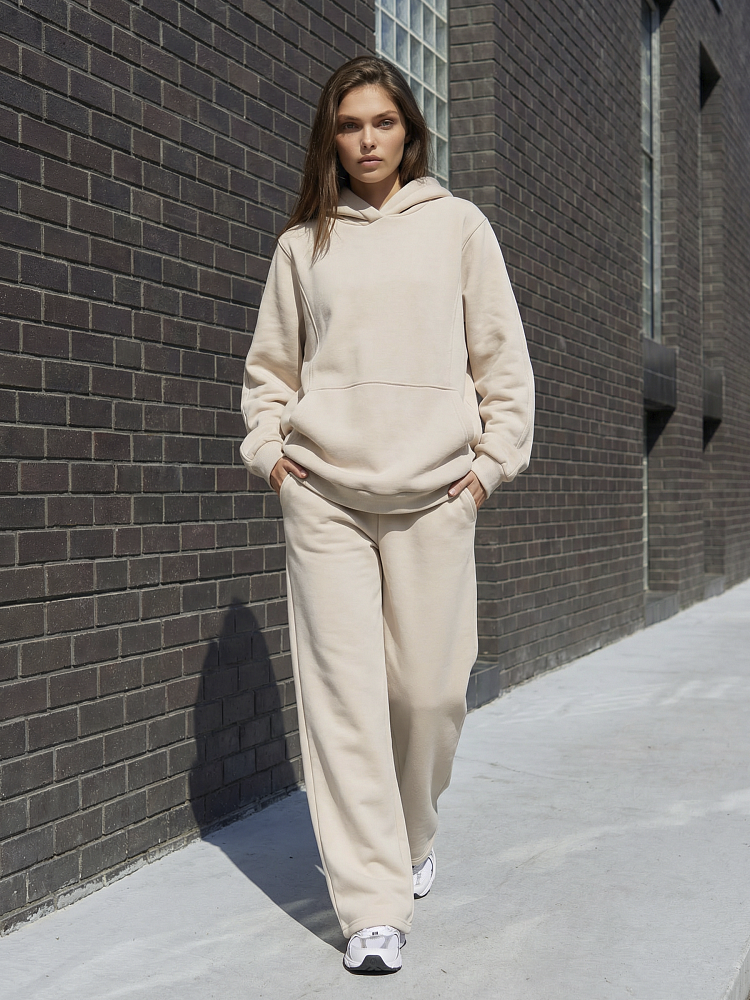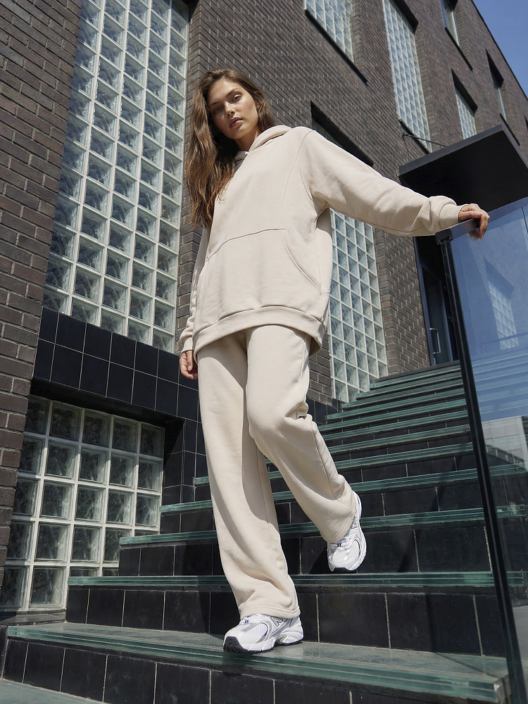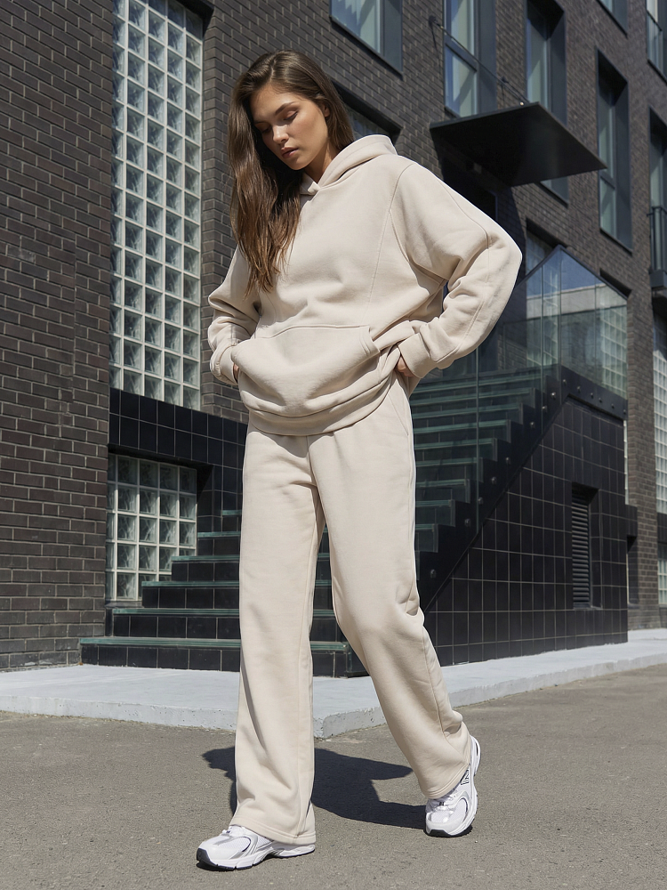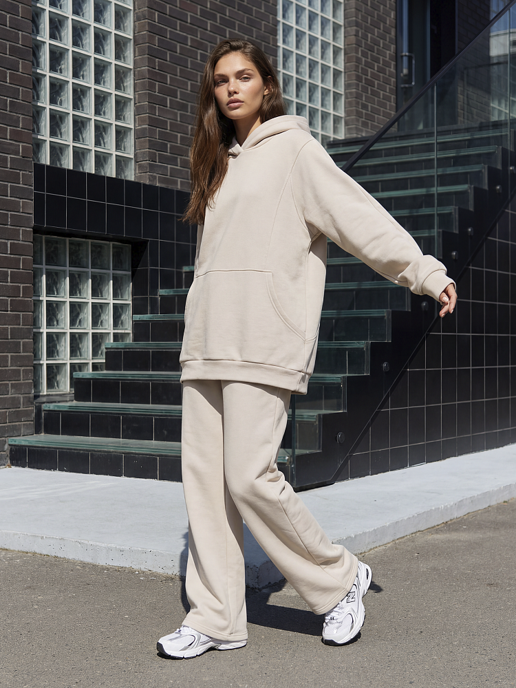 Детали: свободный силуэт, объемный капюшон, карман-кенгуру, широкие брюки на поясе. Футер трехнитка петля.