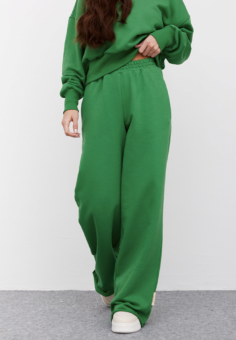 Детали: брюки свободного силуэта, расширенные к низу. Пояс притачной, карманы в боковых швах, низ с необработанным краем.