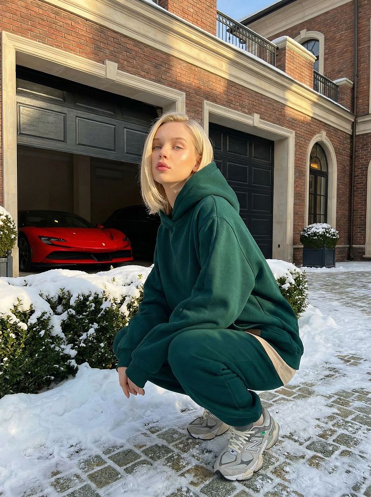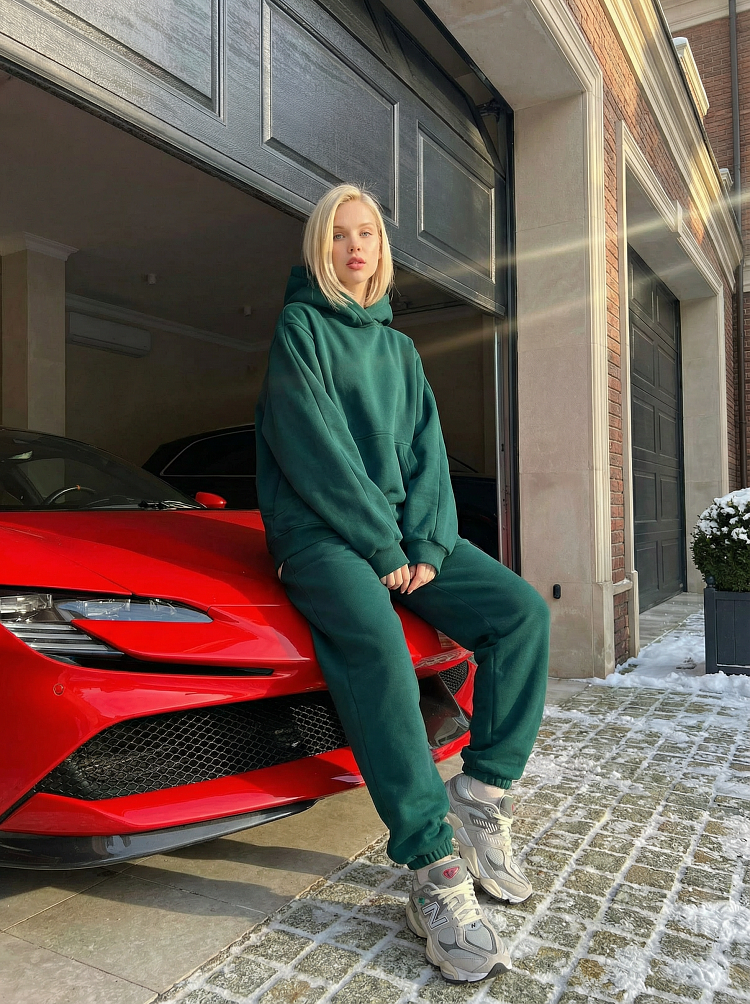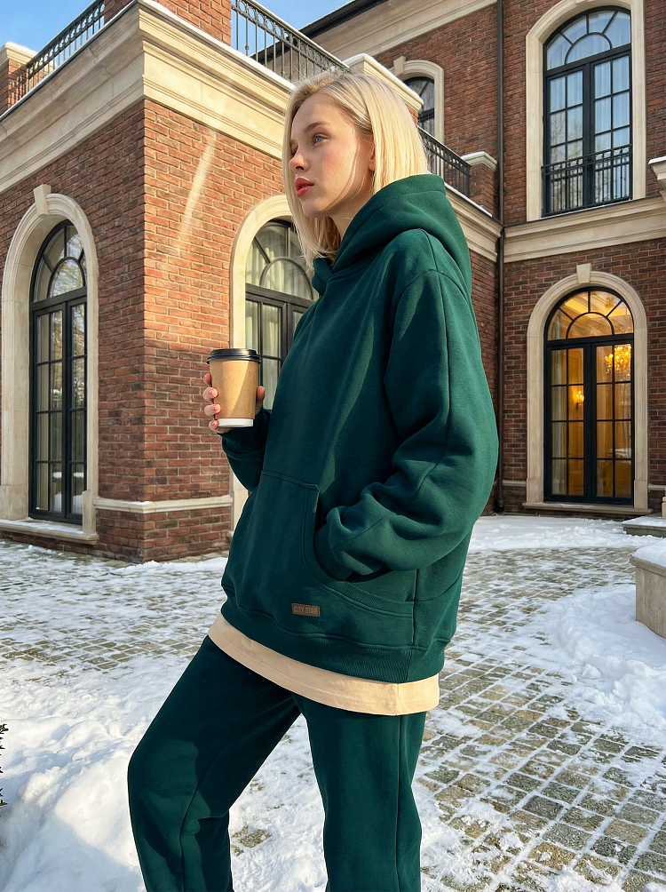 Детали: свободный силуэт, объемный капюшон, карман-кенгуру, широкие штаны на резинках.