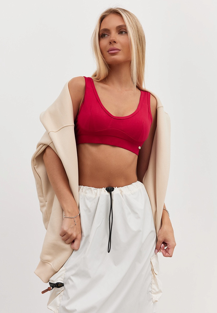Детали: топ с двойной мягкой чашкой, перемычкой по центру и притачным поясом. Широкие бретели, горловина и проймы обработаны бейкой. Сзади средний шов, чашки с вытачками.