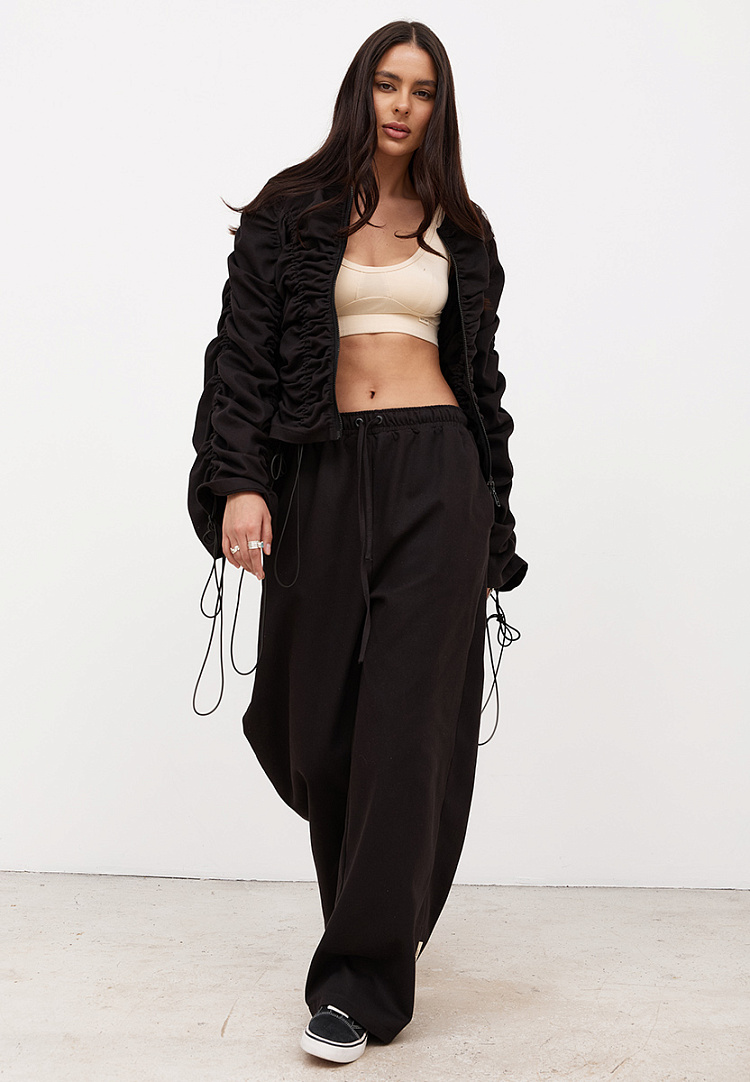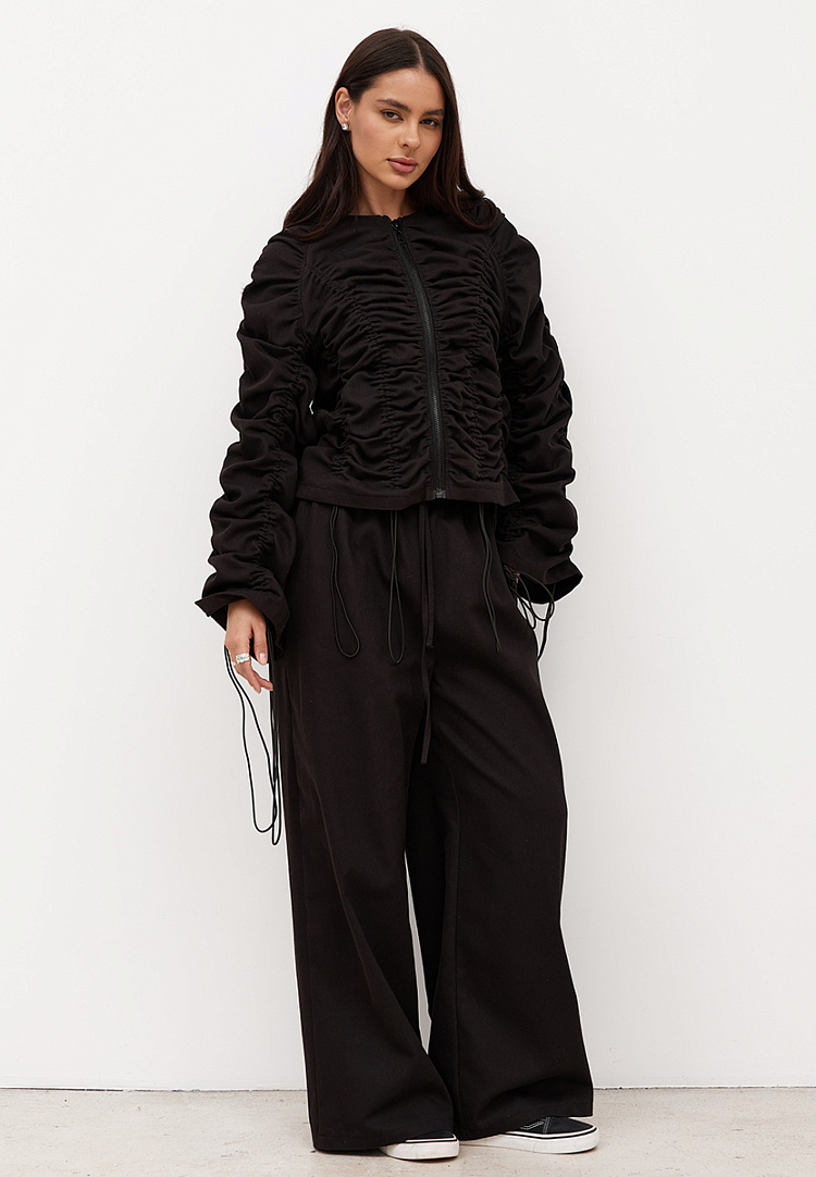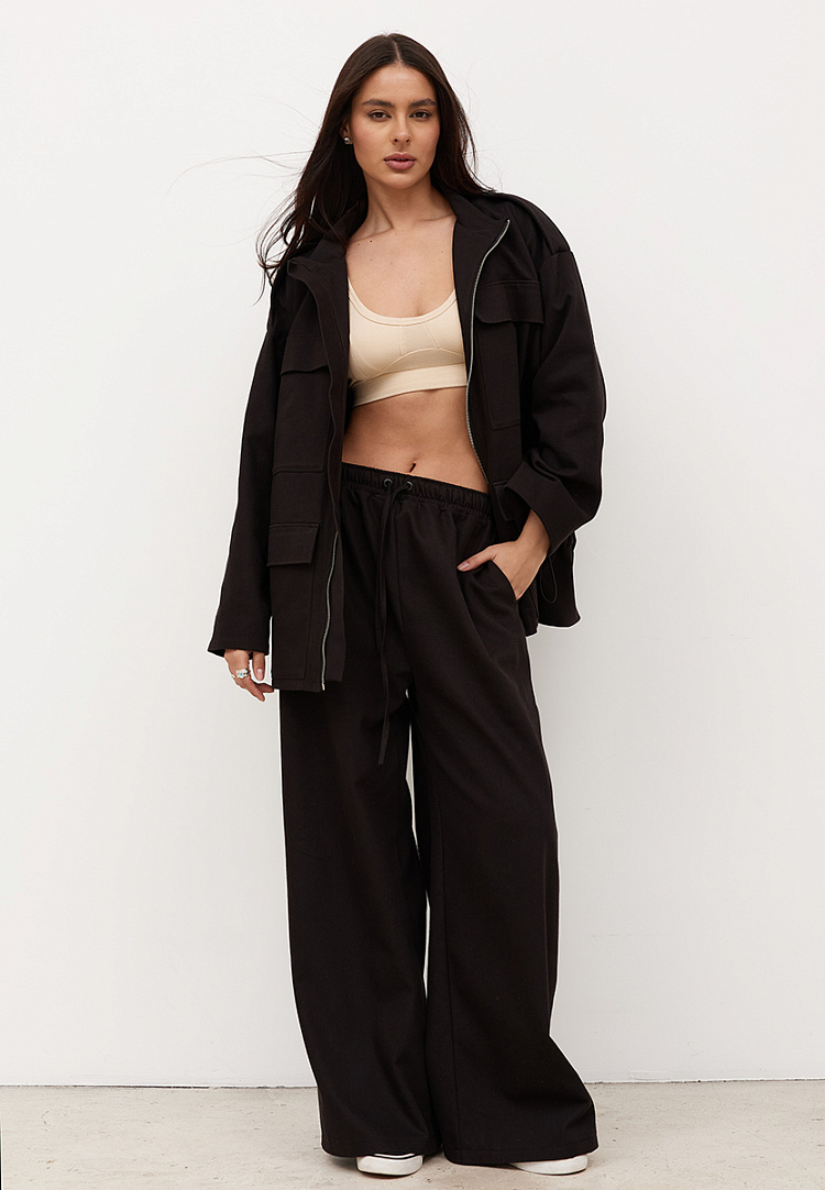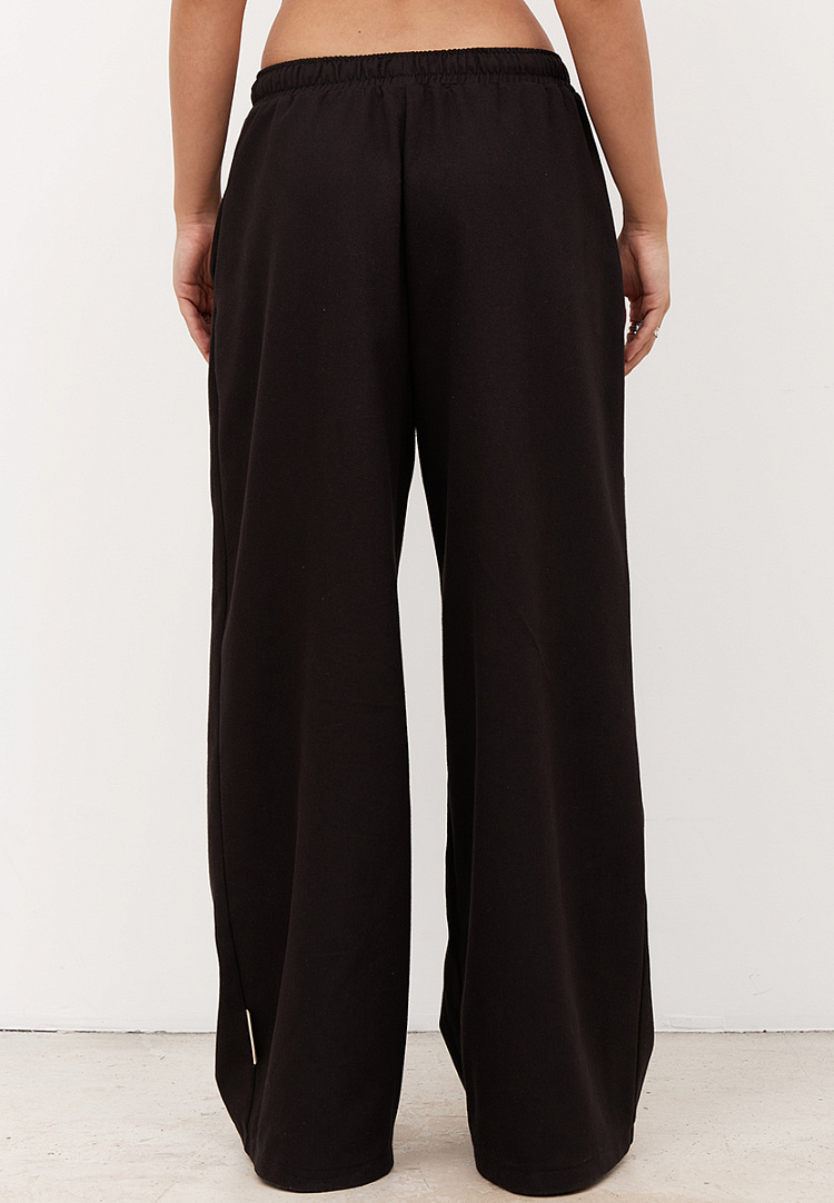 Детали: расширенные брюки спортивного стиля. Имеются два боковых кармана. Пояс на резинке, с двумя люверсами спереди и шнурком из джинсы.