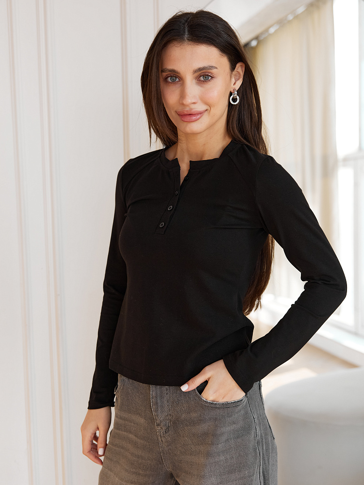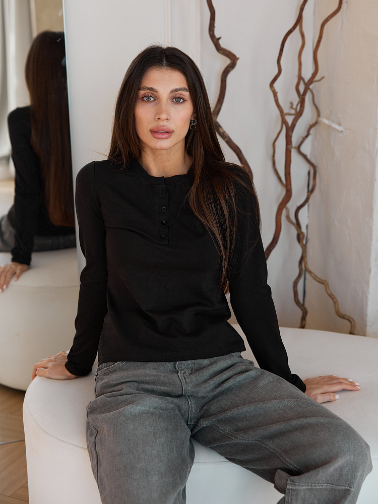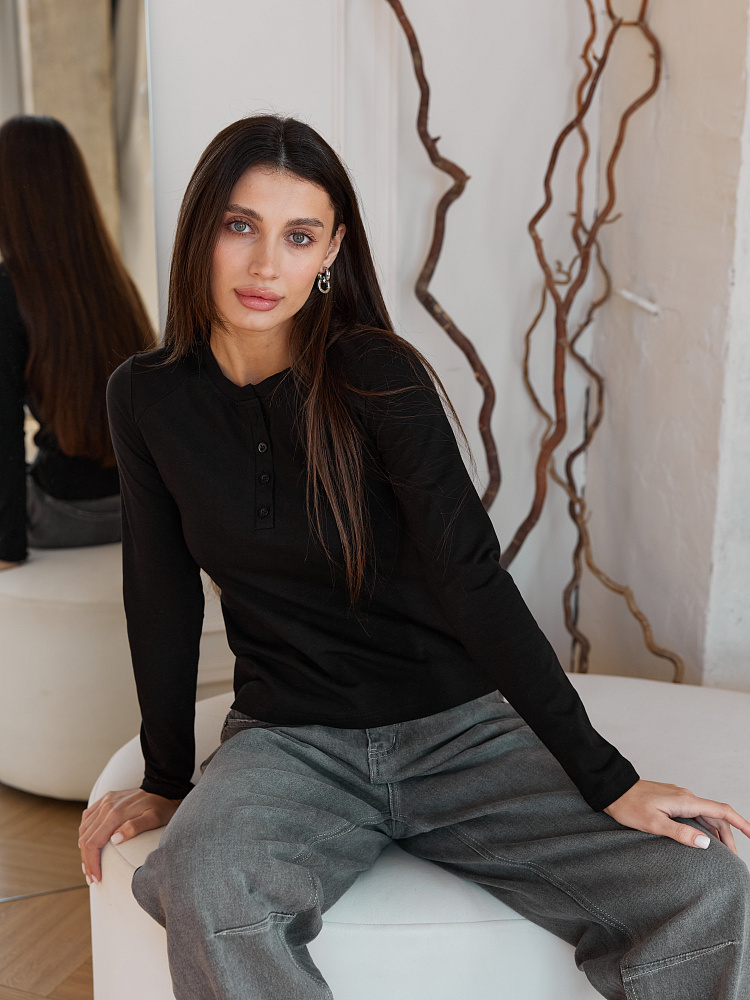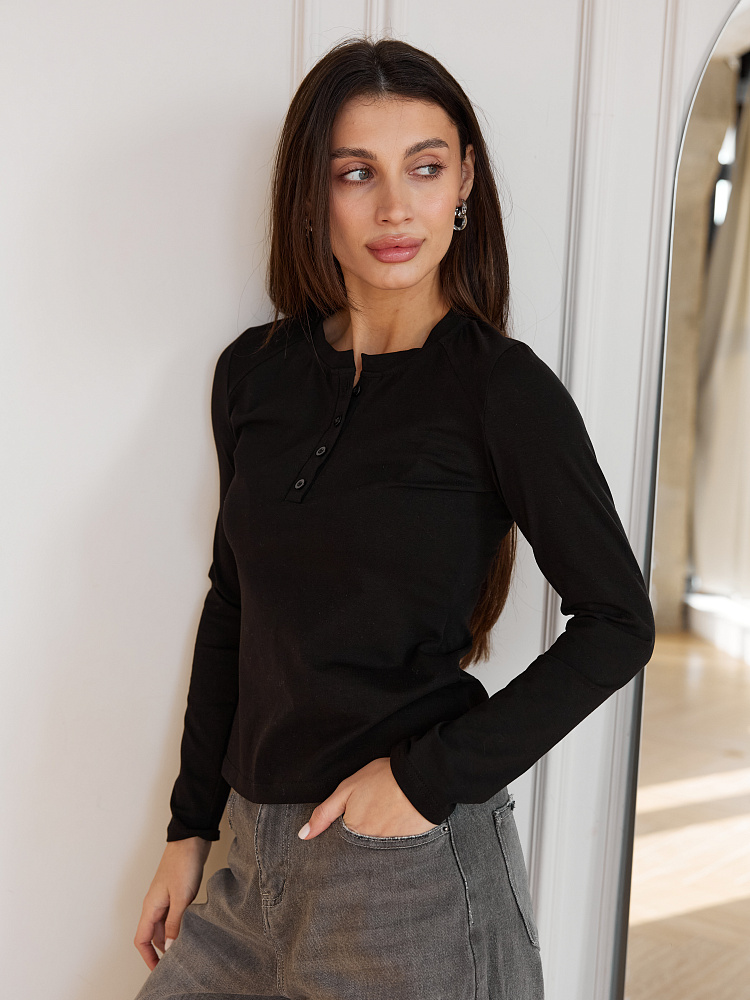 Детали: Лонгслив полуприлегающего силуэта, втачной рукав, овальная горловина с планкой на пуговицах.