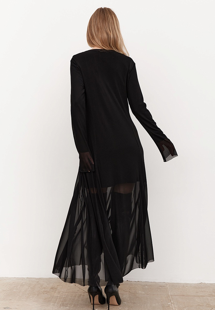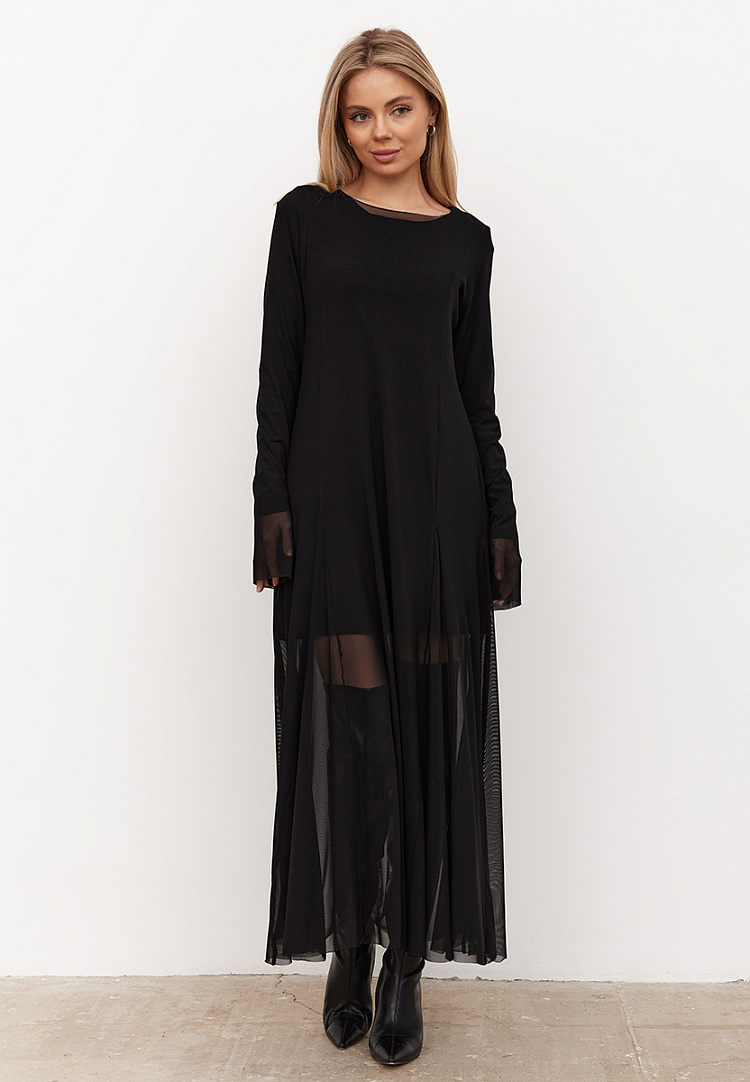 Детали: Платье макси из сетки, расклешенное книзу. Удлиненный рукав из сетки, нижнее платье мини выполнено из кулирки.
