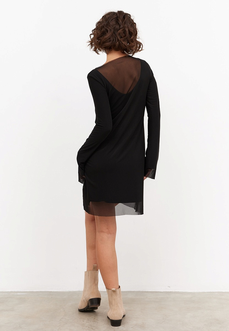 Детали: платье из бамбука, верхняя часть из сетки. Полуприталенный силуэт, небольшое расклешение к низу. Верх платья из сетки чуть длиннее основной, срезы сетки открыты. Рукав втачной, по спинке нижнего платья глубокий вырез, рукав к низу расширен. Внутренне платье по всем срезам обработана.
