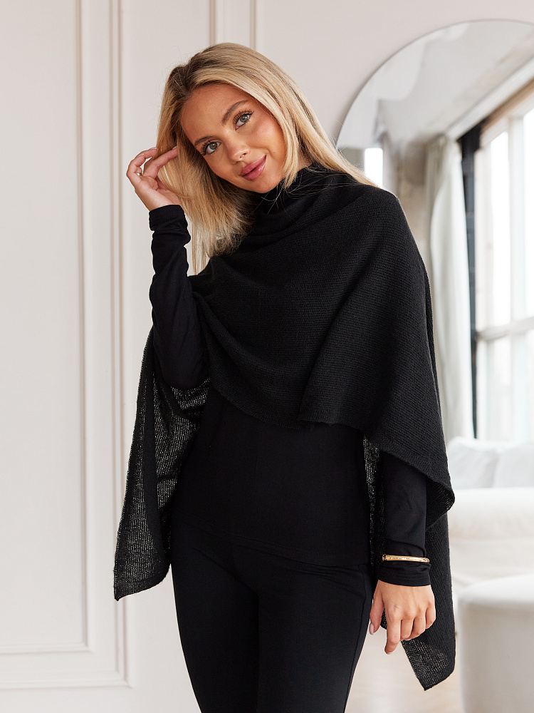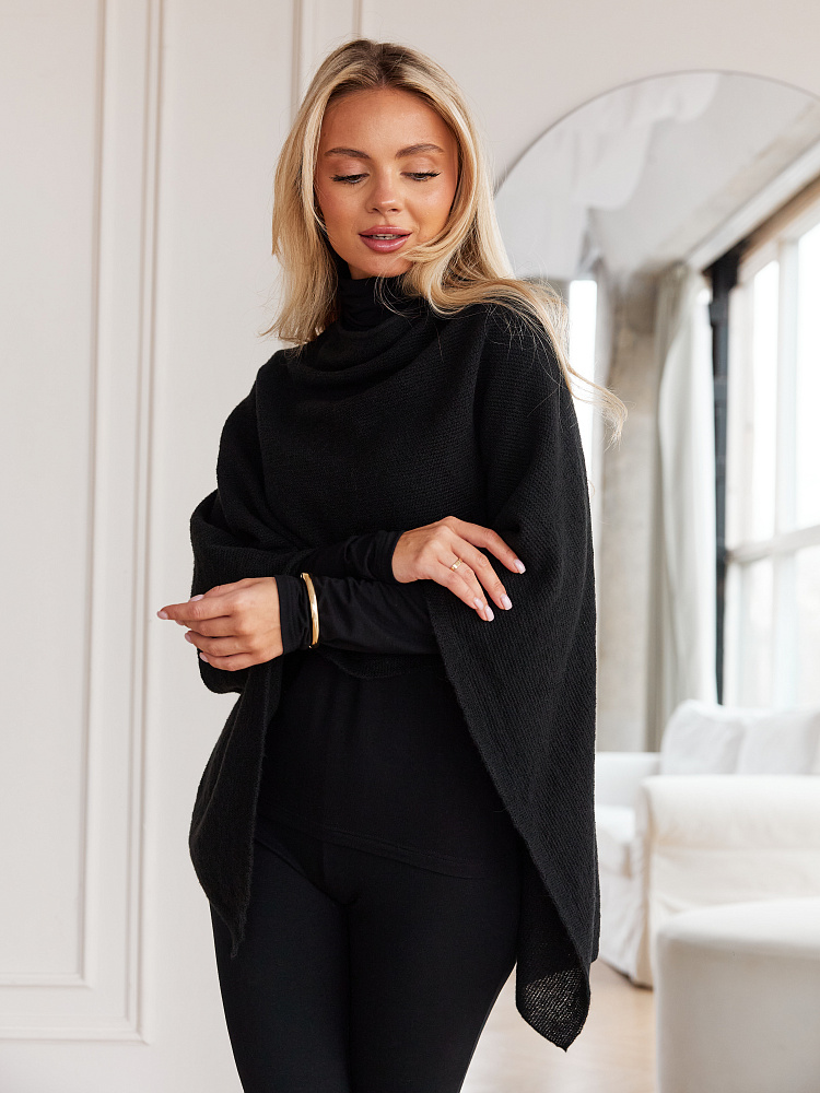 Вязаная накидка выполнена в технике паутинка, что придаёт ей невесомость, прозрачность и трендовый вид. Она не перегружает образ, а наоборот — добавляет лёгкую текстуру, подчёркивая женственность и индивидуальность.