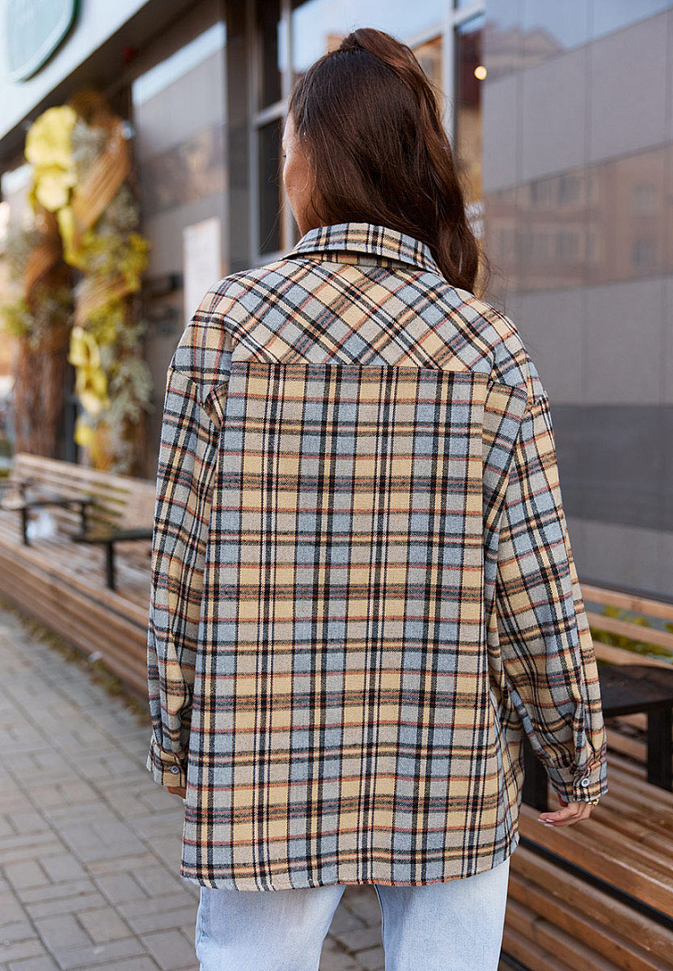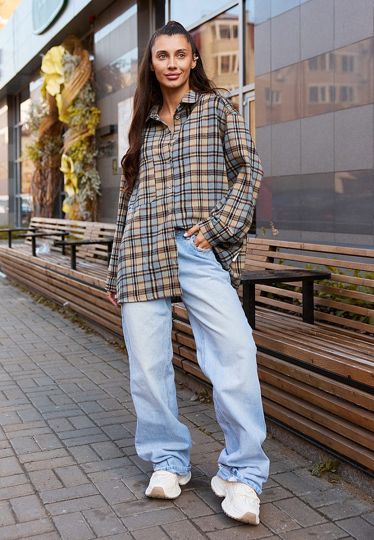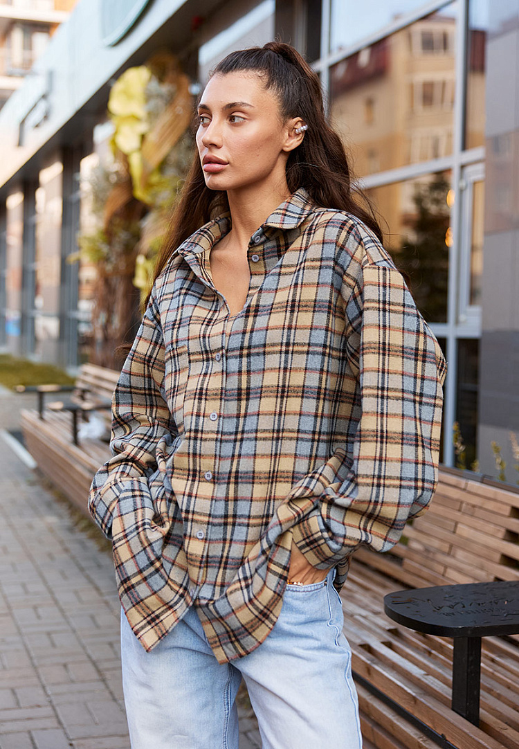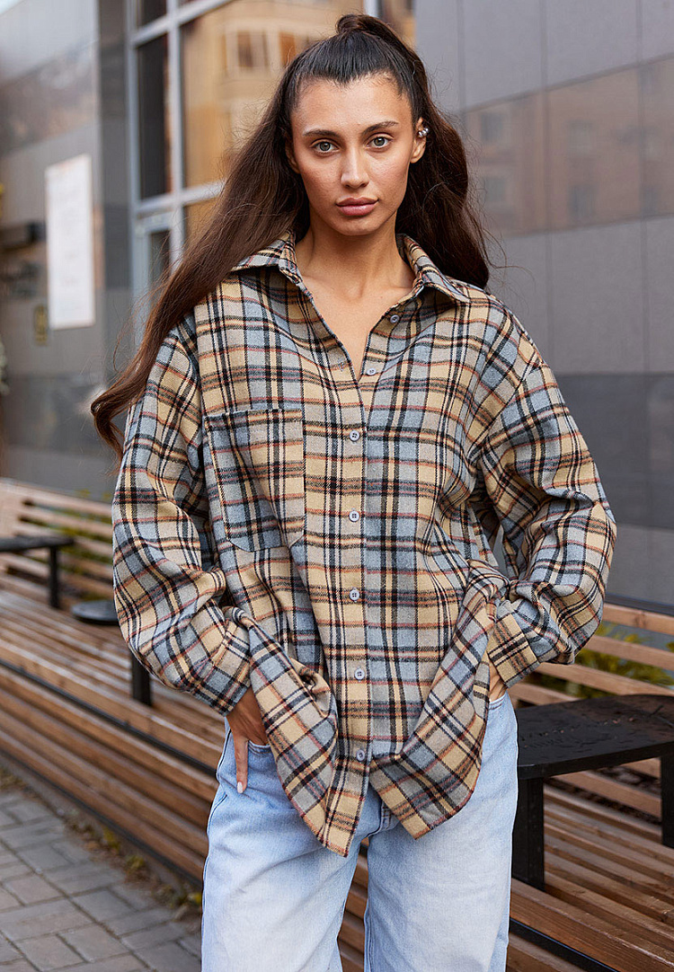 Детали: рубашка оверсайз в клетку. По переду на правой полочке накладной карман, по спинке кокетка. Рукав спущенный, по низу рукава защип и складка, имеется манжет. Воротник рубашечный, на стойке застежка на пуговицы.