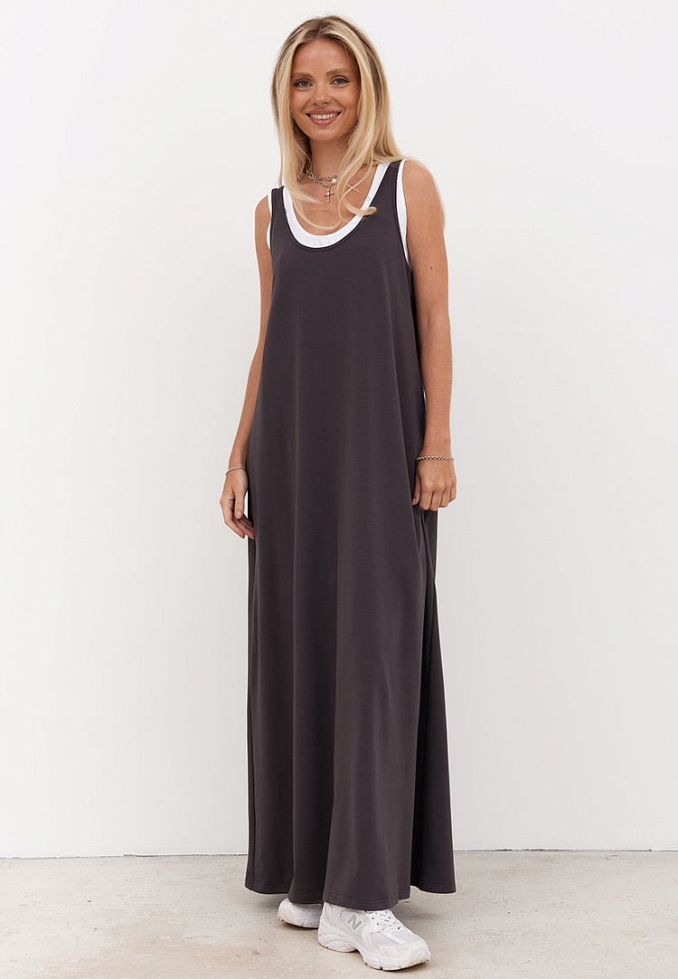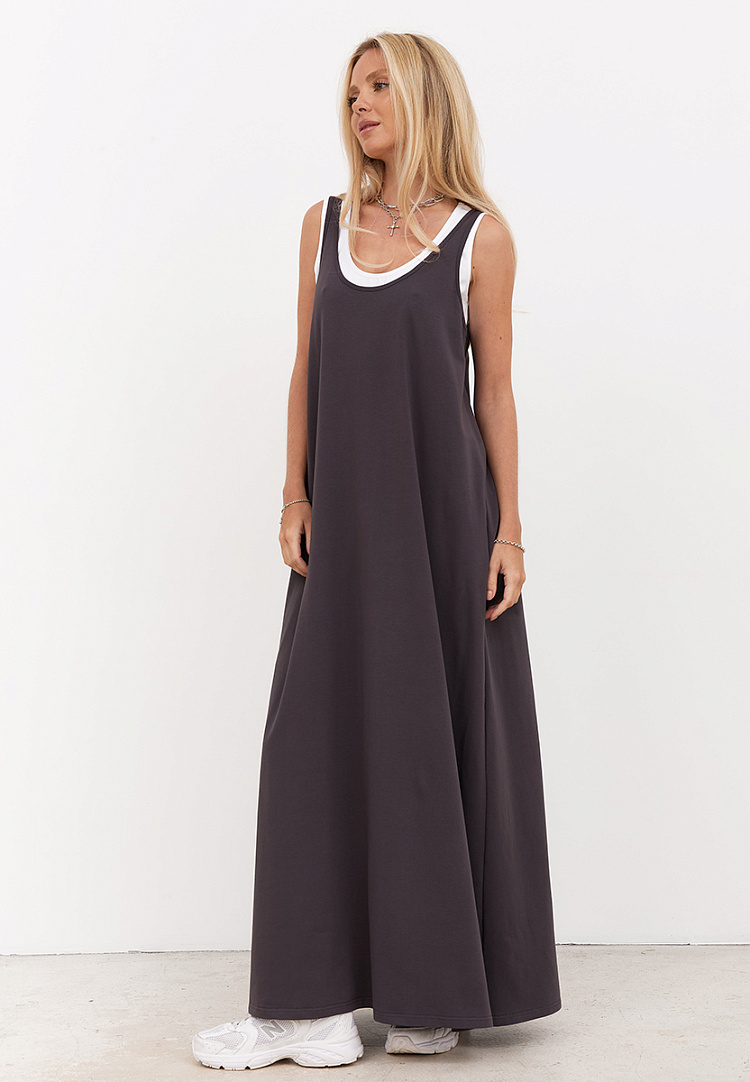 Двойное платье-майка отличается невесомостью и особым удобством. Спортивный и городской стиль объединились в комфортном летнем образе.
