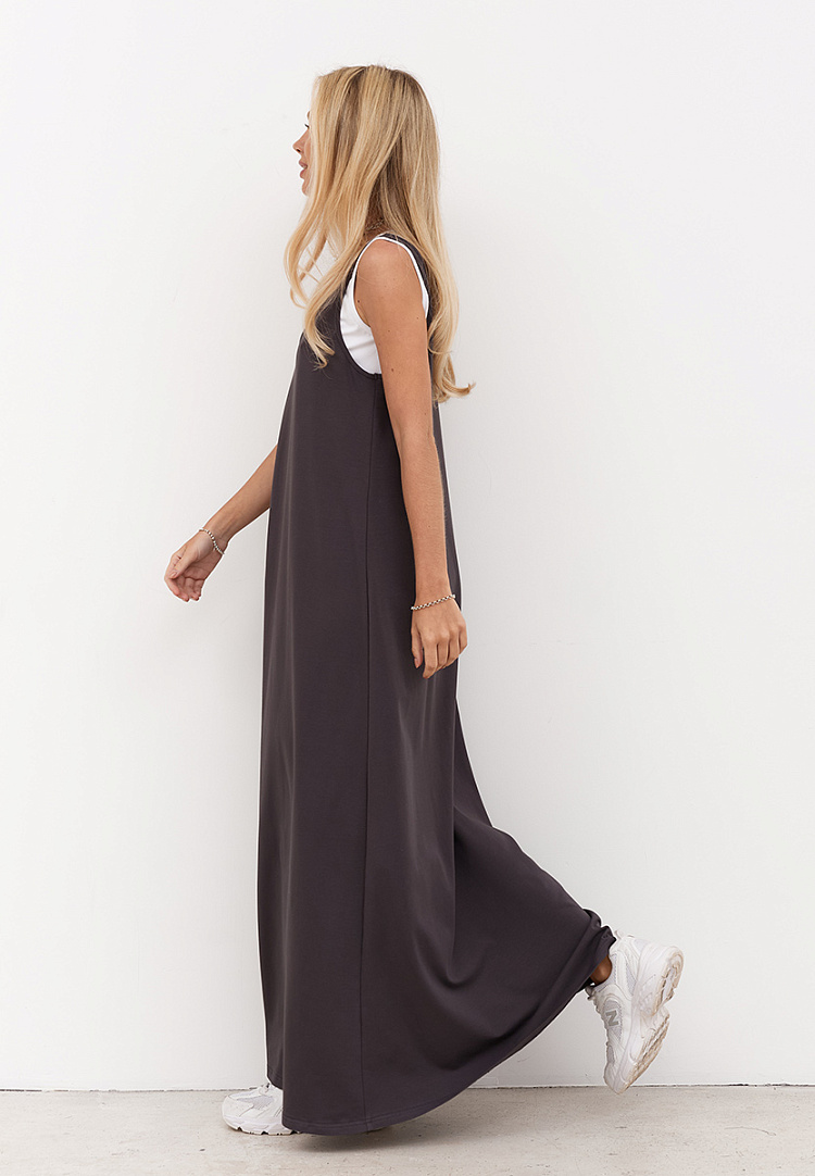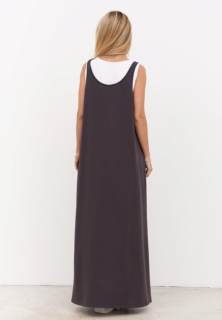 Детали: сарафан из кулирки. Нижний слой сарафана белого цвета. Верхний сарафан длиной макси, силуэт трапеция.