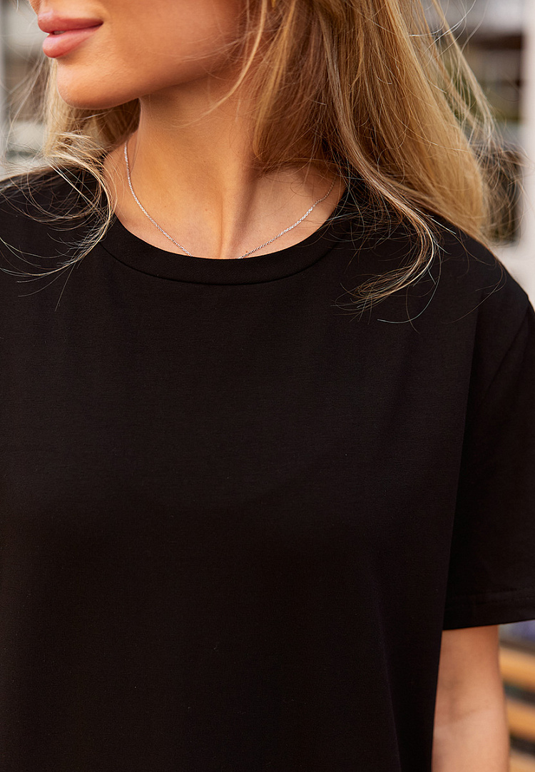 Детали: прямой силуэт, круглый вырез горловины, два разреза по бокам.