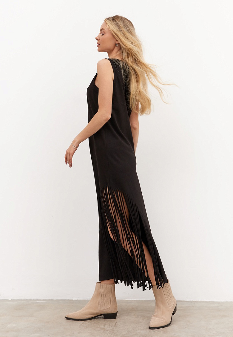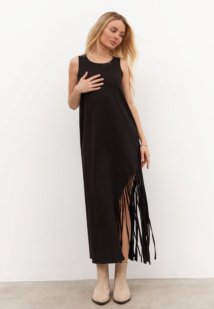 Детали: платье миди из кулирки, слегка расширенное к низу. С левой стороны бахрома фигурной формы.