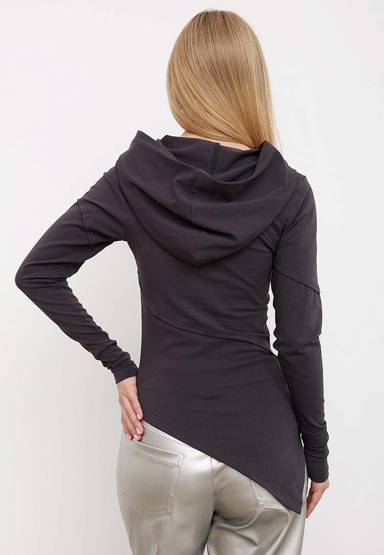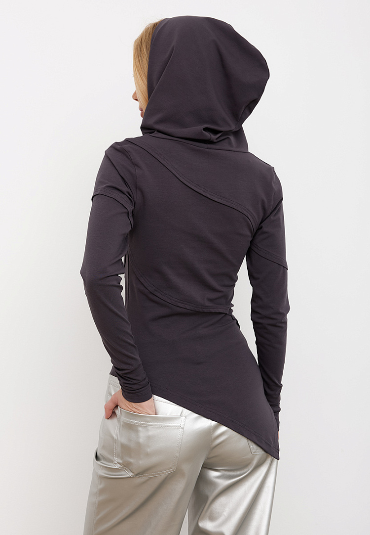 Детали: лонгслив прилегающего силуэта с капюшоном. Спереди, сзади и на рукавах - фигурные членения. Асимметричный низ, рукава немного удлинены. Капюшон объемный.