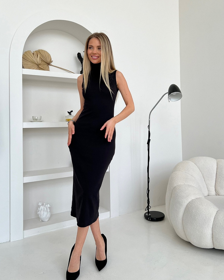 Детали: платье облегающего силуэта, без рукавов, с высоким воротником "стойка". Пройма обработана окантовкой.