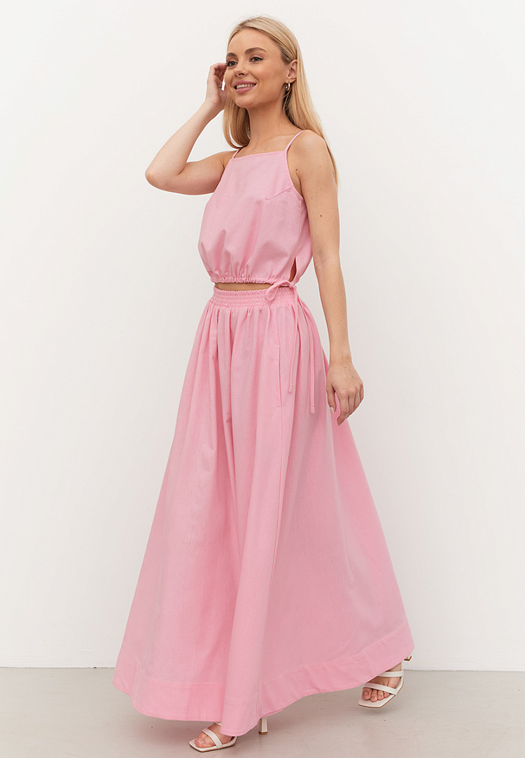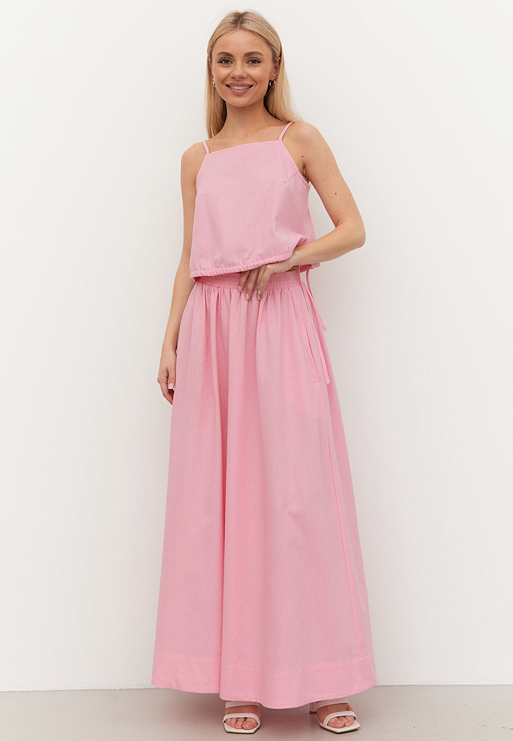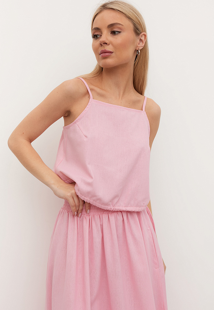 Детали: топ А — образного силуэта, на регулирующихся бретелях. В левом боковом шве разрез, по низу кулиса.