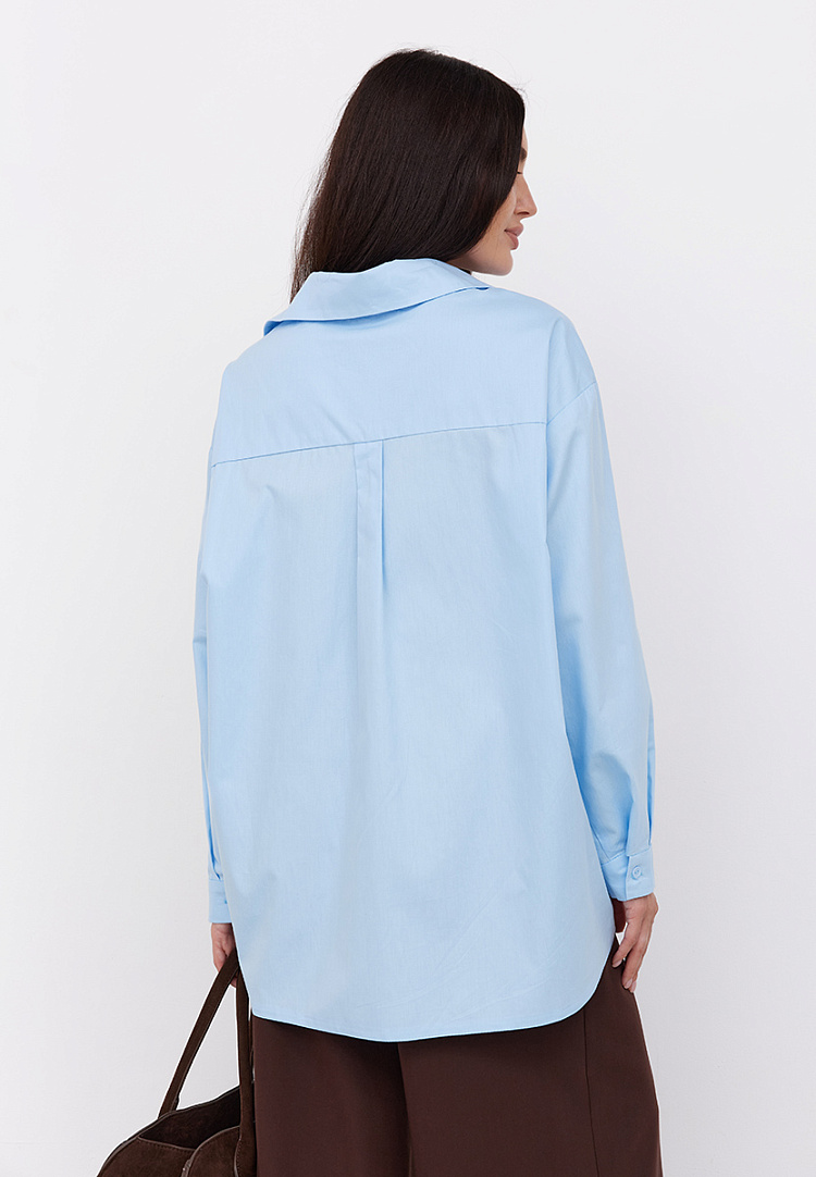 Детали: длинная рубашка свободного кроя. По спинке имеется двойная кокетка. Рукава рубашечного кроя. По низу рукава пришит манжет на одну пуговицу. Спущенная линия плеча.