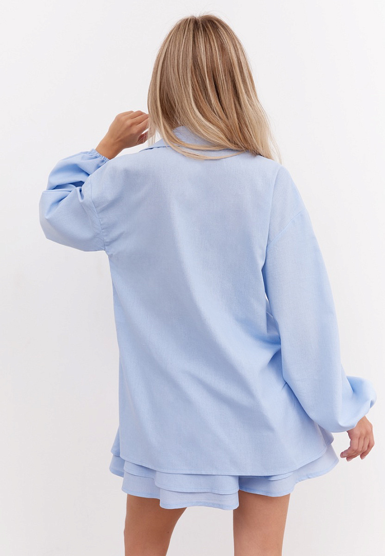 Рубашка свободного силуэта. Рукава-фонарики добавляют романтичности блузе, которую можно легко сочетать с другими вещами или подвязывать, как на фото.