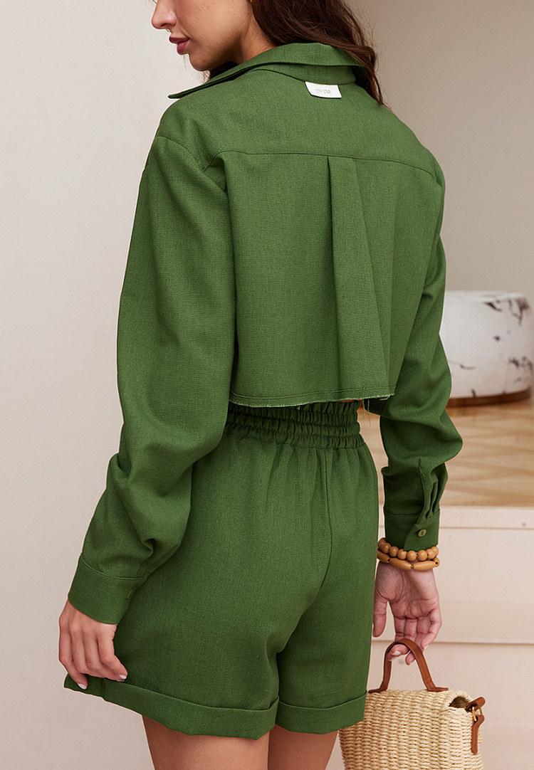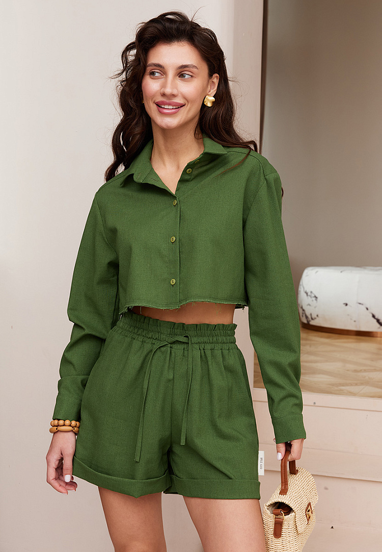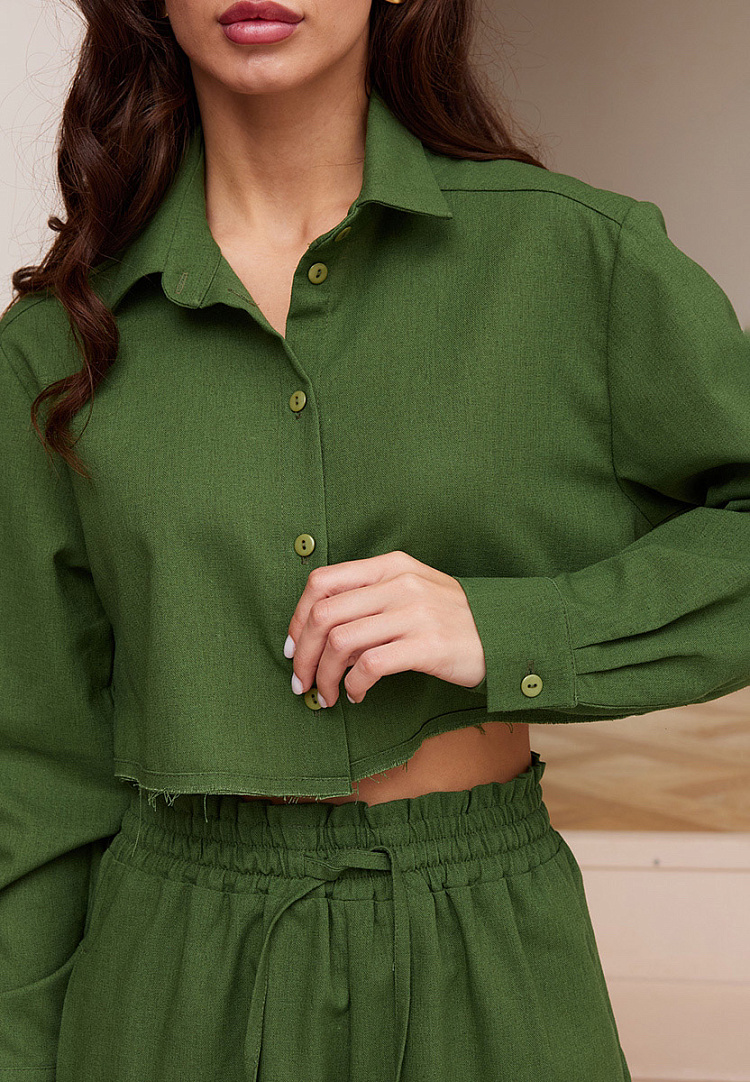 Детали: укороченная рубашка свободного кроя. Низ изделия обработан открытым срезом.