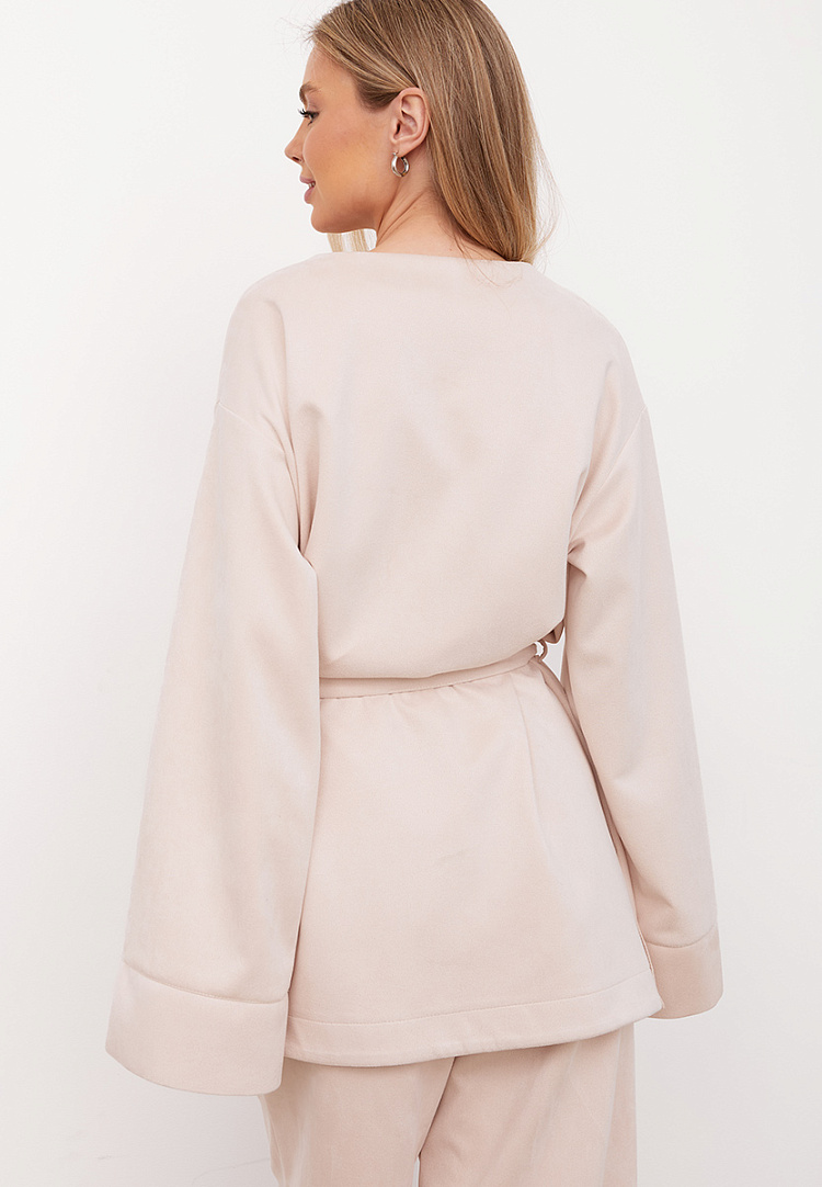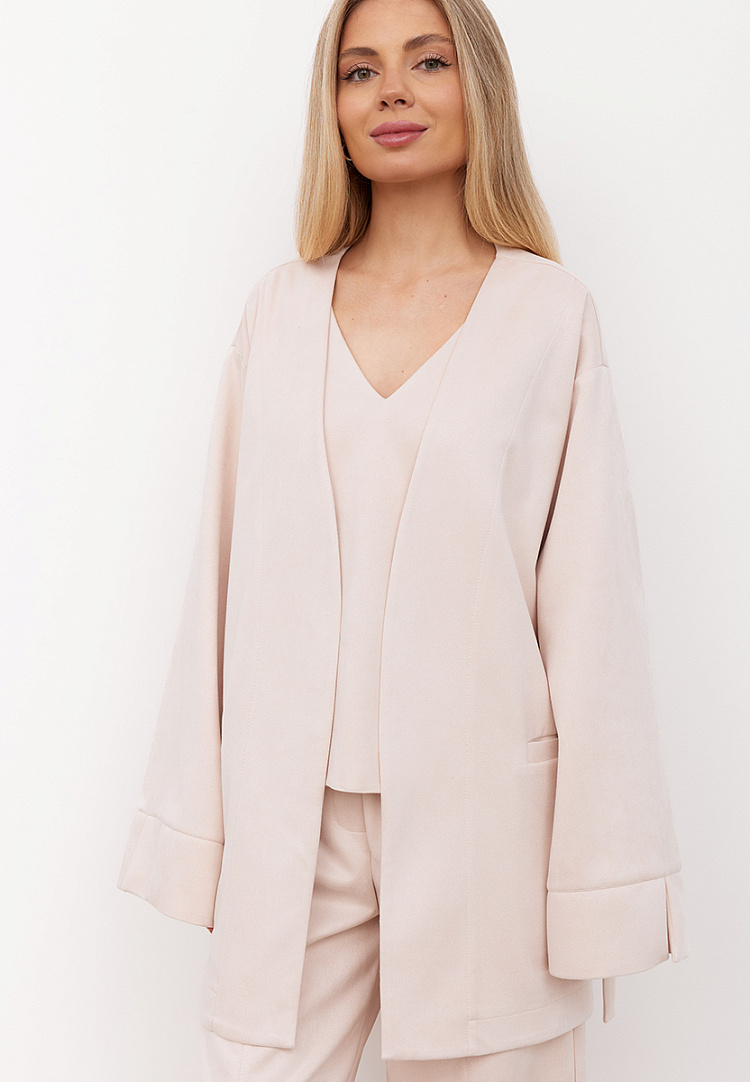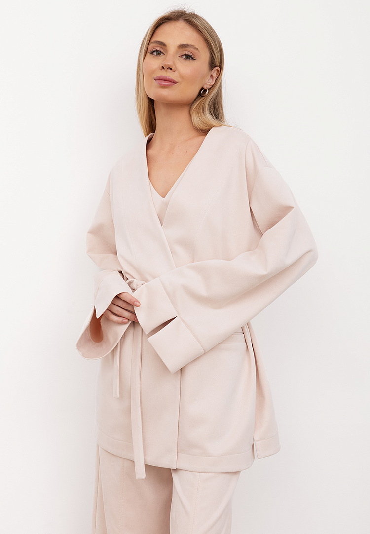Детали: кимоно свободного кроя из замши. Рукава втачные, с разрезами на манжетах. Спереди разрезные карманы с листочками. По бокам снизу небольшие разрезы. С кимоно в комплекте идет пояс из замши.
