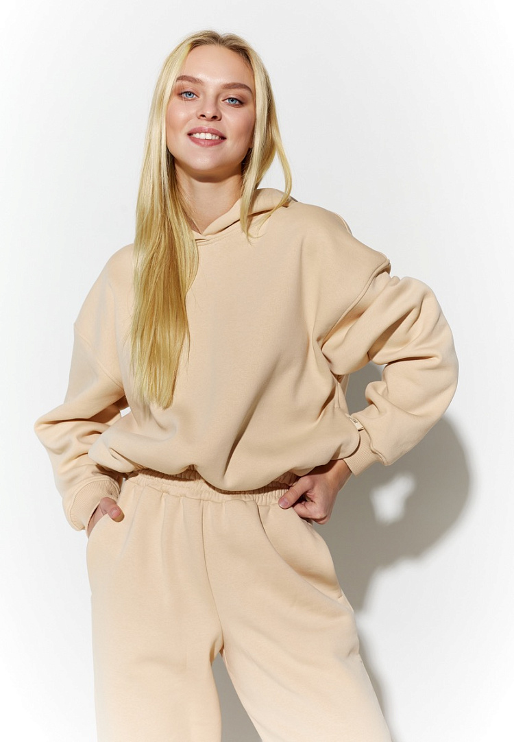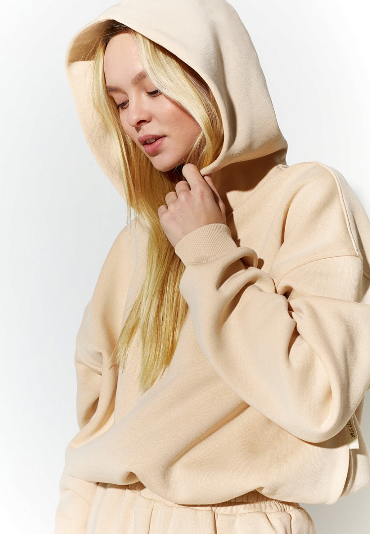 Детали: укороченное худи свободного силуэта. По низу полочки и спинки пояс с резинкой, в боковых швах глубокие карманы. Капюшон двойной, рукава спущенные по низу, манжет из кашкорсе.