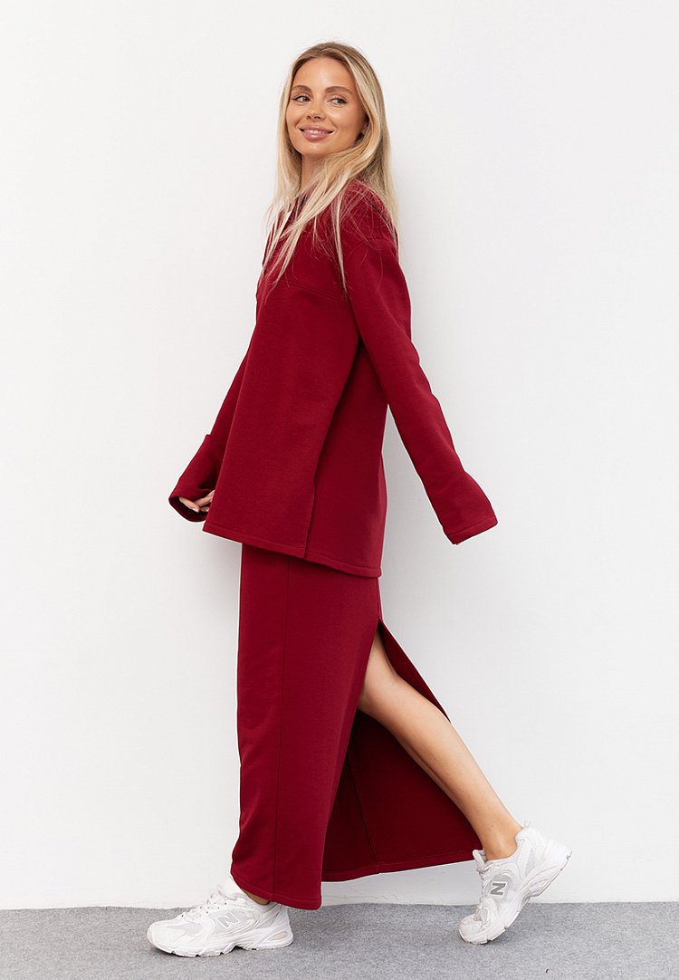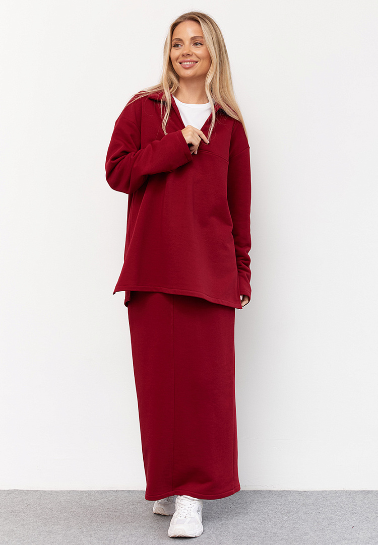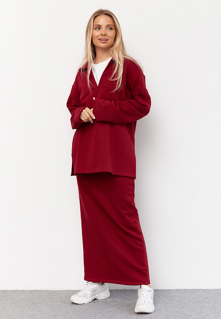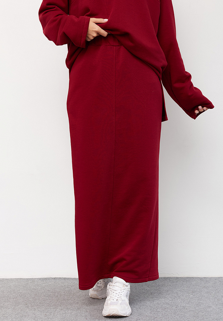 Детали: Базовая юбка длины макси. Пояс на резинке. Разрез сзади. По переднему шву декоративная строчка. Изнанка-петля.