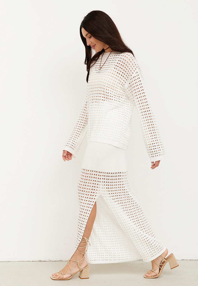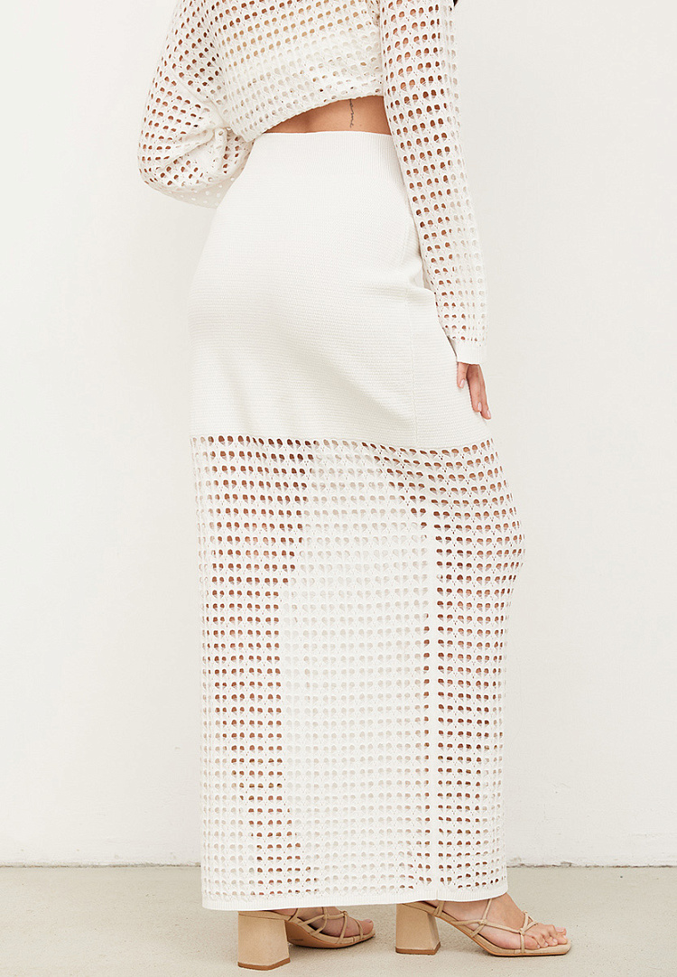Вязаная юбка из легкой пряжи создана для летних вечеров. Она подчеркивает бедра и делает походку более эффектной. Юбка вяжется на нашем производстве.