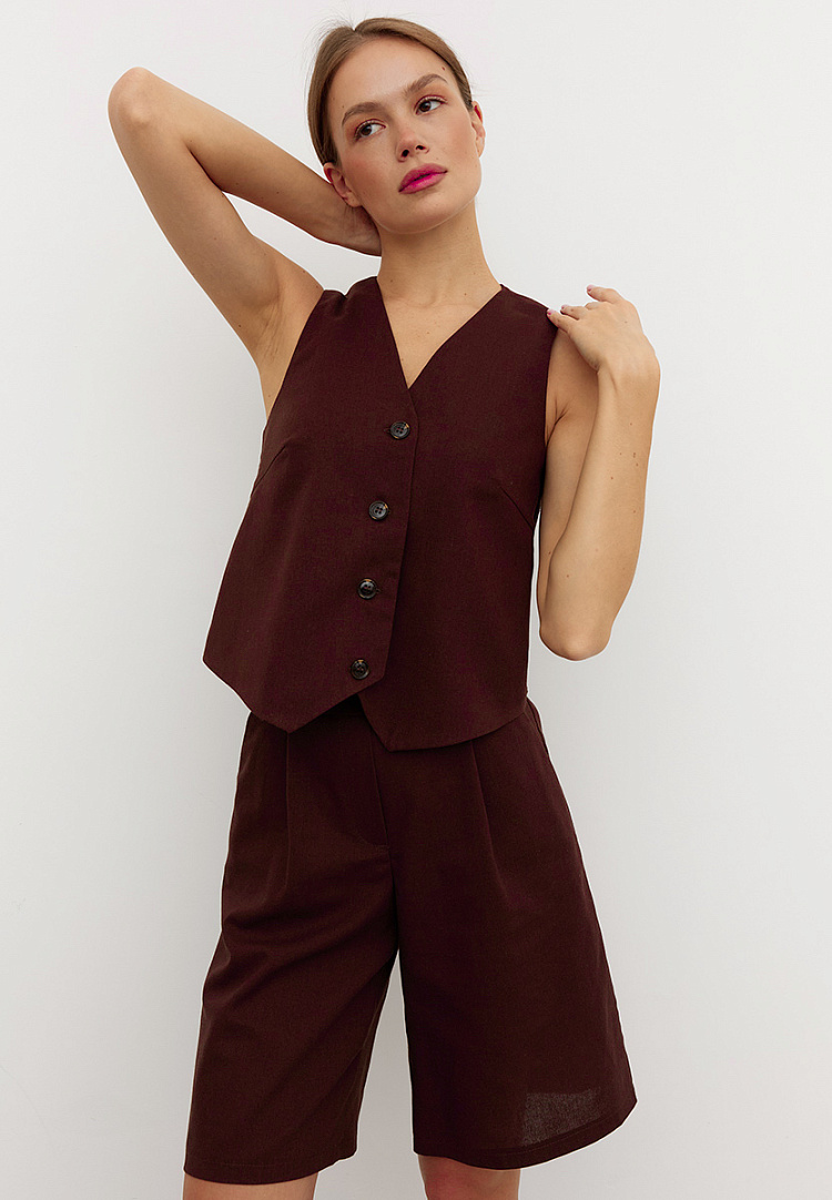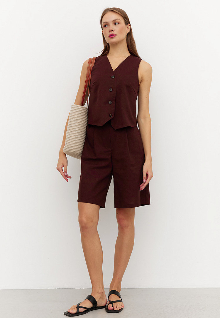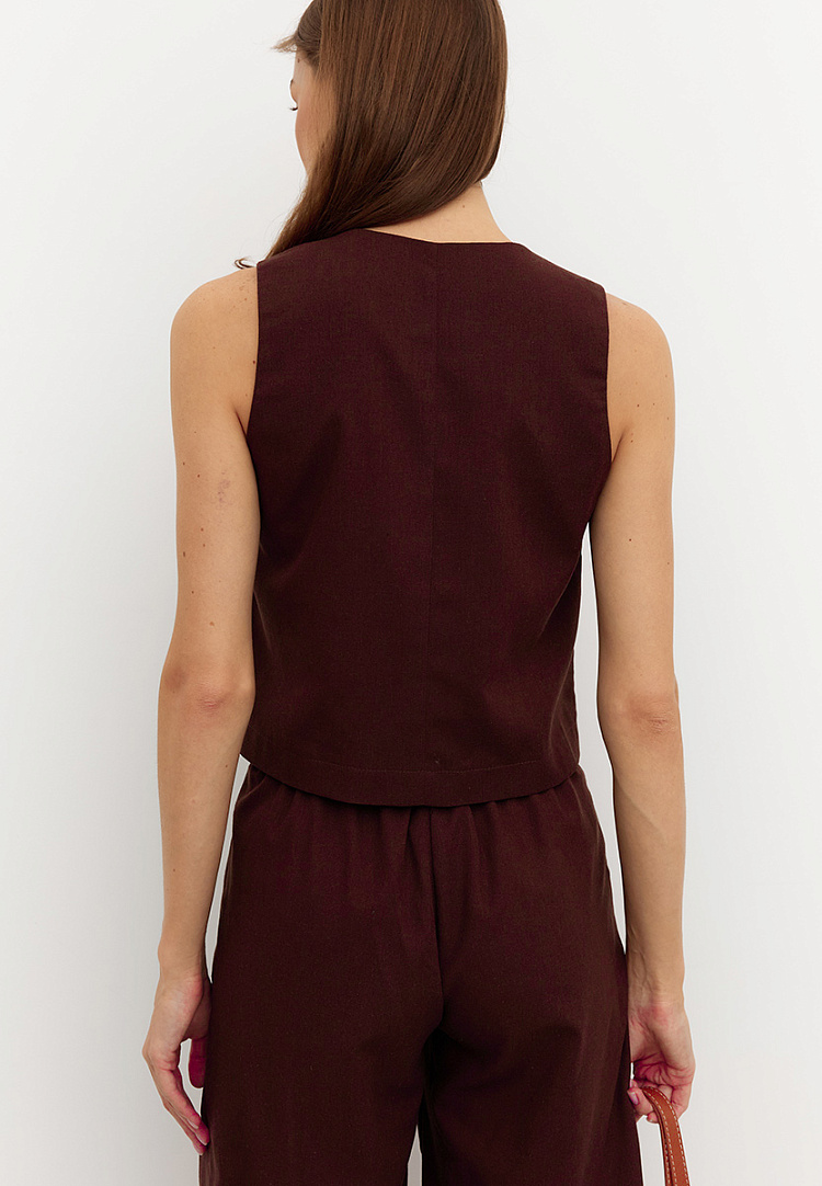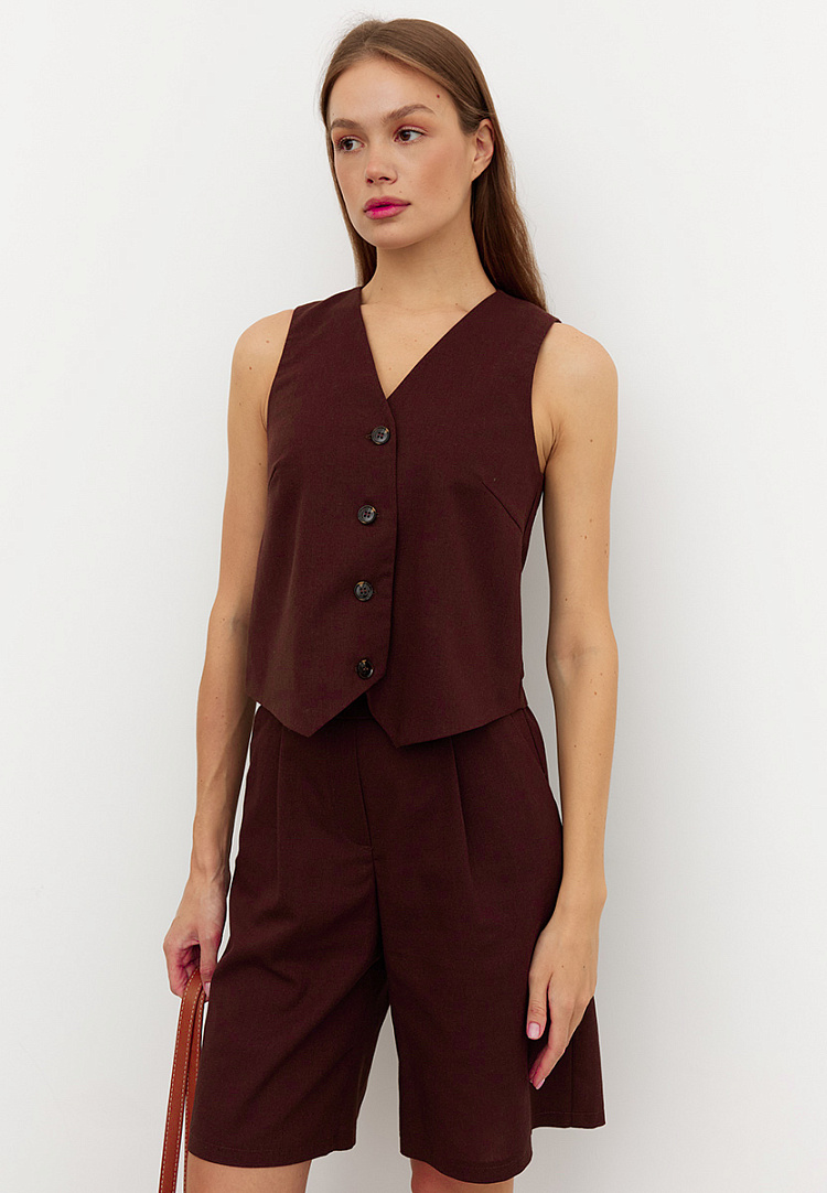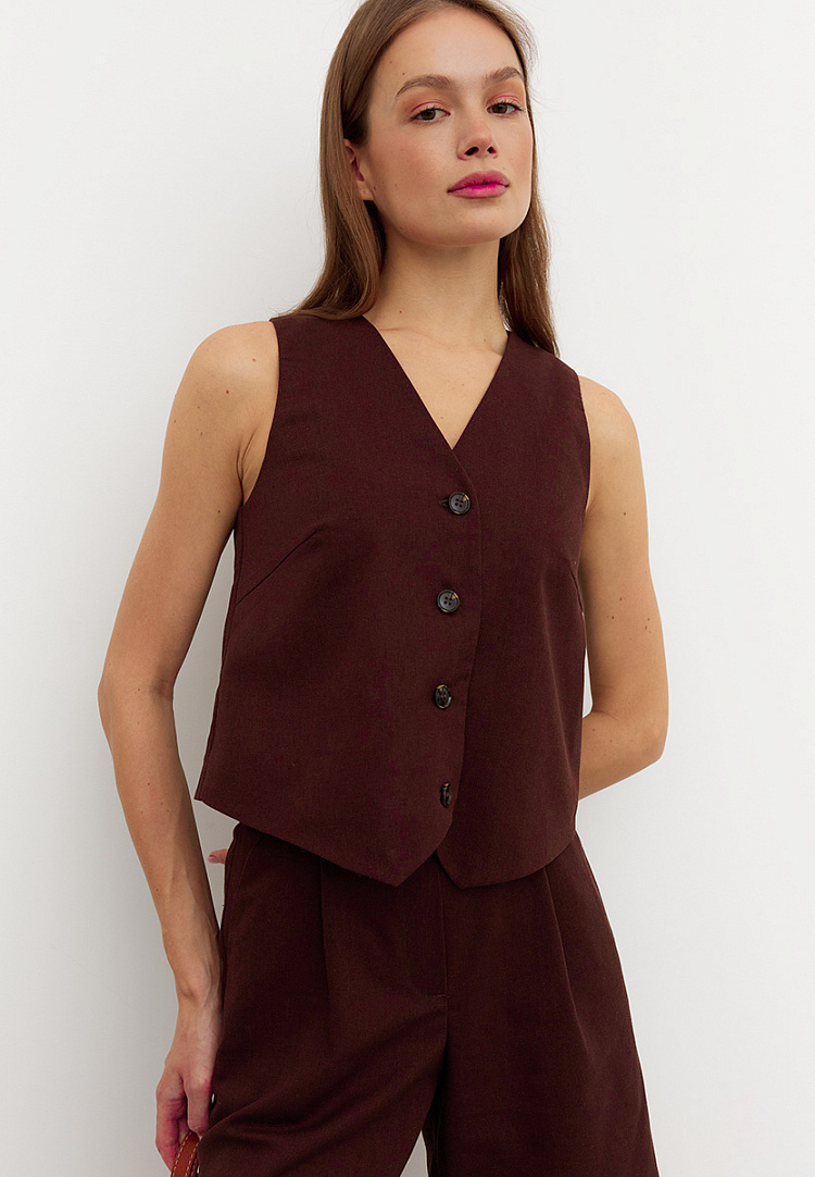 Детали: жилет прямого кроя, по переду имеется грудовая вытачка. Перед жилета двухслойный, застежка на пуговицы. Спинка со средним швом.
