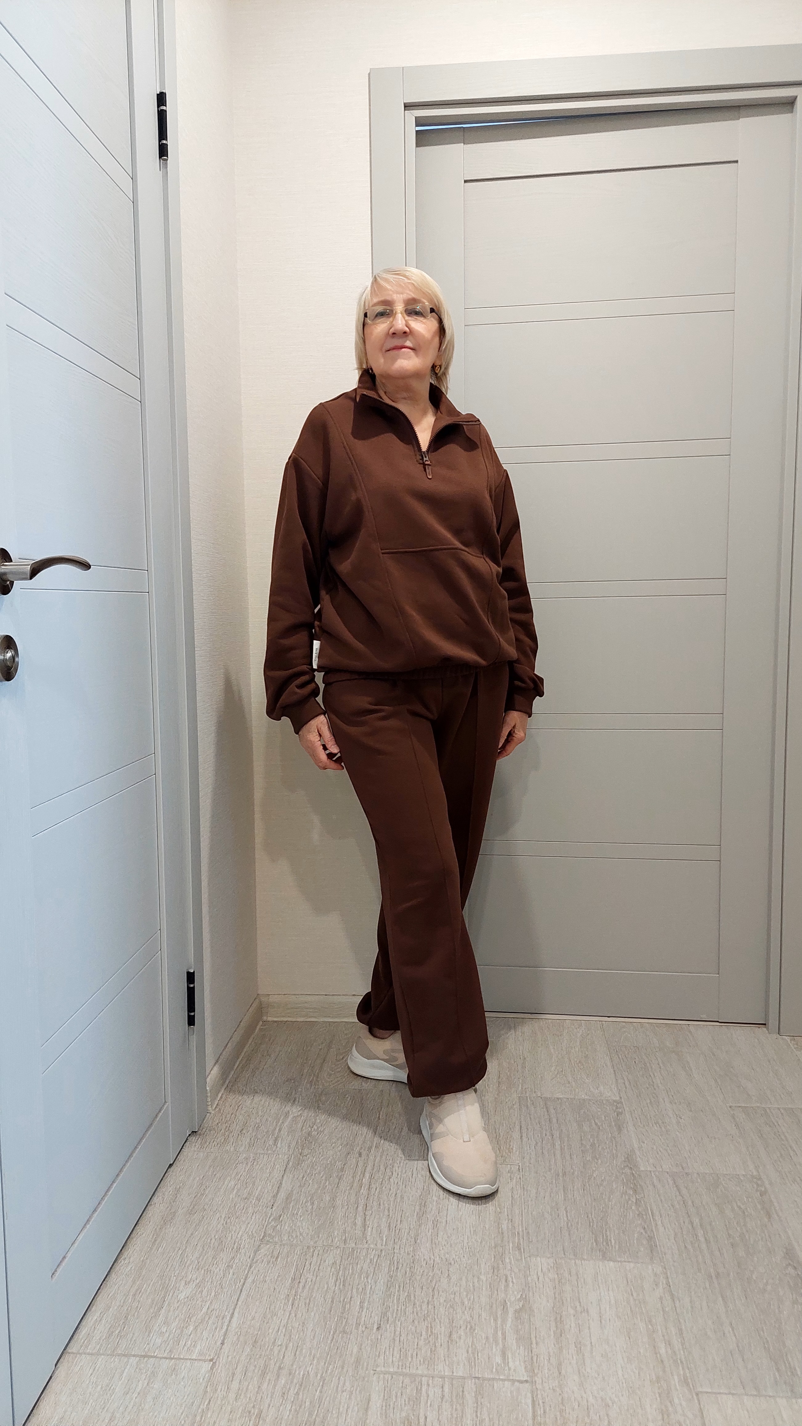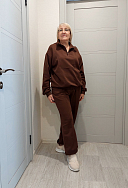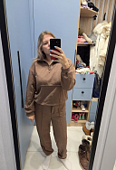 Размер XL, цвет шоколадный. Костюм очень понравился, идёт размер в размер, цвет, стрелки на брюках, укороченный свитшот делают костюм особенным. Не тонкий, в меру теплый, на весну будет самое то. Спасибо City Star !!!