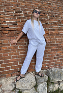 Отличный костюм на лето. Свободный, рукава подвергнуты, Нижний край футболки не обработан. У брюк удобные карманы, но не глубокие. На мой рост 161 идеальная длина брюк. У дочери рост 172 , На ней как укороченный вариант брюк. Классный костюм