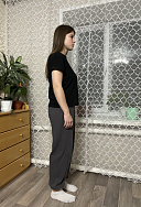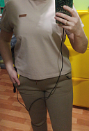 Отличная футболка, универсальная базовая модель, у меня отличный комплект получился с сине-серыми широкими брюками трио. Так же хорошо смотрится и с юбками, шортами и джинсами