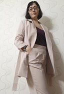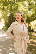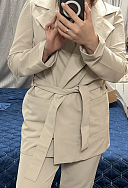 У меня два костюма, один желтый, второй светло-бежевый. Ткань очень разная. Так что имейте это ввиду, хотя составы написаны одинаковые. Желтая ткань меньше мнется, хб почти не чувствуется. Но ткань очень классная. Бежевый больше хб, мнется хорошо. И тоньше что-ли. Проблема брюк с поясом да есть, я их не достегиваю. Хотя размер мой, больше точно нет смысла брать. Рекомендую учесть ошибку и увеличить размер в поясе брюк, так как животик есть у многих. Я брала М. Бежевый пиджак гораздо шире сделан в покрое, чем желтый, но тоже свободный. Хочу еще березовый взять.