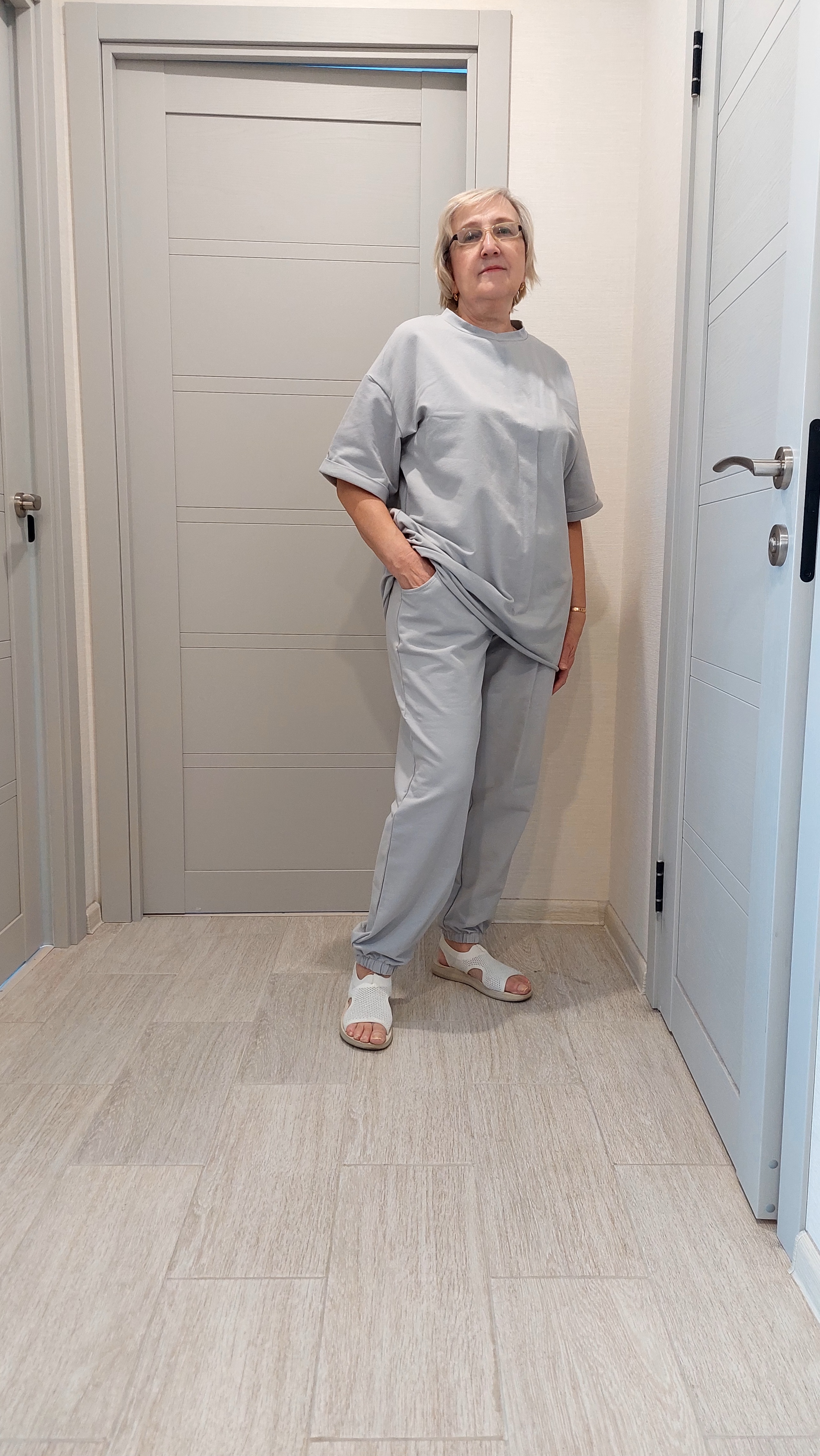 Обожаю этот костюмчик) Свободный, комфортный, и снимать его совсем не хочется) Ткань плотная, но благодаря размеру оверсайз в нём не жарко.